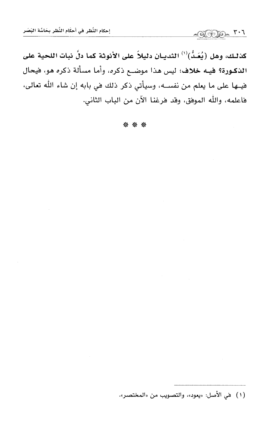 كذلك، وهل (يُعَدُّ) (¬1) الثديان دليلًا على الأنوثة كما دلَّ نبات اللحية على الذكورة؟ فيه خلاف، ليس هذا موضع ذكره، وأما مسألة ذكره هو، فيحال فيها على ما يعلم من نفسه، وسيأتي ذكر ذلك في بابه إن شاء الله تعالى، فاعلمه، والله الموفق، وقد فرغنا الآن من الباب الثاني.