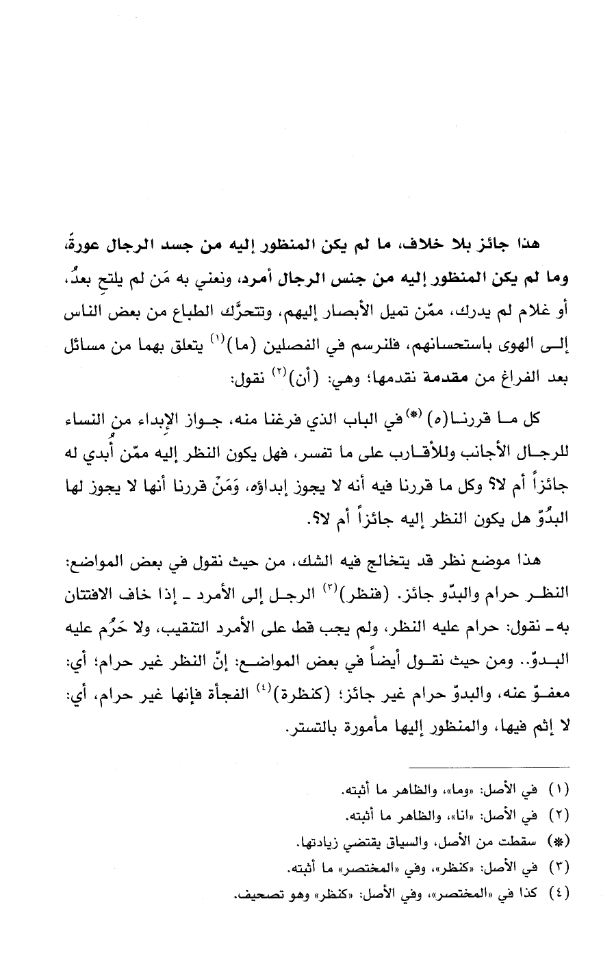 هذا جائز بلد خلاف، ما لم يكن المنظور إليه من جسد الرجال عورة، وما لم يكن المنظور إليه من جنس الرجال أمرد، ونعني به مَن لم يلتحِ بعدُ، أو غلام لم يدرك، ممّن تميل الأبصار إليهم، وتتحرَّك الطباع من بعض الناس إلى الهوى باستحسانهم، فلنرسم في الفصلين (ما) (¬1) يتعلق بهما من مسائل بعد الفراغ من مقدمة نقدمهاة وهي: (أن) (¬2) نقول: