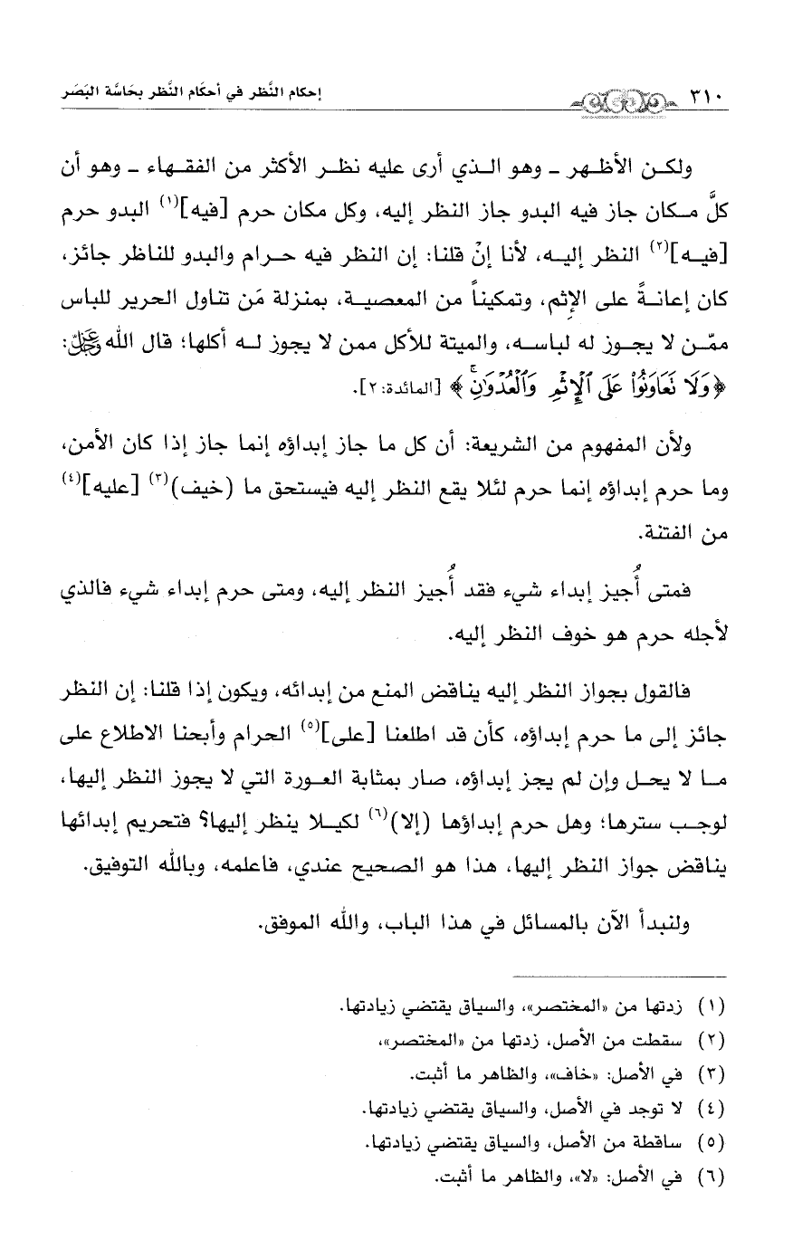 فالقول بجواز النظر إليه يناقض المنع من إبدائه، ويكون إذا قلنا: إن النظر جائز إلى ما حرم إبداؤه، كأن قد اطلعنا [على] (¬5) الحرام وأبحنا الإطلاع على ما لا يحل وإن لم يجز إبداؤه، صار بمثابة العورة التي لا يجوز النظر إليها، لوجب سترها، وهل حرم إبداؤها (إلا) (¬6) لكيلا ينظر إليها؟ فتحريم إبدائها يناقض جواز النظر إليها، هذا هو الصحيح عندي، فاعلمه، وبالله التوفيق.