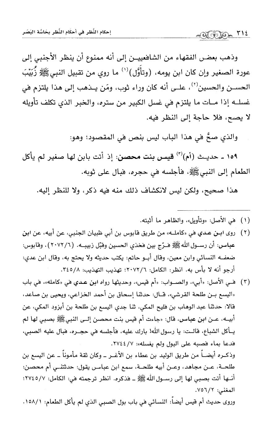 (¬3) فى الأصل: "أبي"، والصواب: "أم قيس" وحديثها رواه ابن عدي في "كامله"، في باب "اليسع بن طلحة القرشي"، قال: حدثنا إسحاق بن أحمد الخزاعي، ويحيى بن صاعد، قالا: حدثنا عبد الوهاب بن فليح المكي، ثنا جدي اليسع بن طلحة بن أبزود المكي، عن أبيه، عن ابن عباس، قال: "جاءت أم قيس بنت محصن إلى النبي - صلى الله عليه وسلم - بصبي لها لم يأكل الشباع، قالت: يا رسول الله! بارك عليه، فأجلسه في حجره، فبال عليه الصبي، فدعا بماء فصبه على البول ولم يغسله": 7/ 2744.