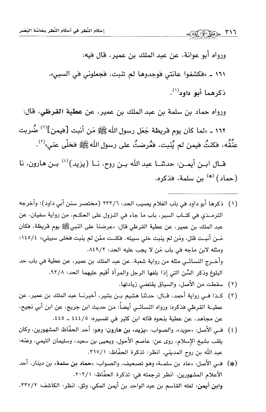 (¬1) ذكرها أبو داود في باب الغلام يصيب الحد: 6/ 233 (مختصر سنن أبي داود)، وأخرجه الترمذي في كتاب السير، باب ما جاء في النزول على الحكم، من رواية سفيان، عن عبد الملك بن عمير، عن عطية القرظي قال: "عرضنا على النبي - صلى الله عليه وسلم - يوم قريظة، فكان مَن أنبت قتل، ومَن لم ينبت خلي سبيله، فكنت ممّن لم ينبت فخلى سبيلي": 4/ 145.
