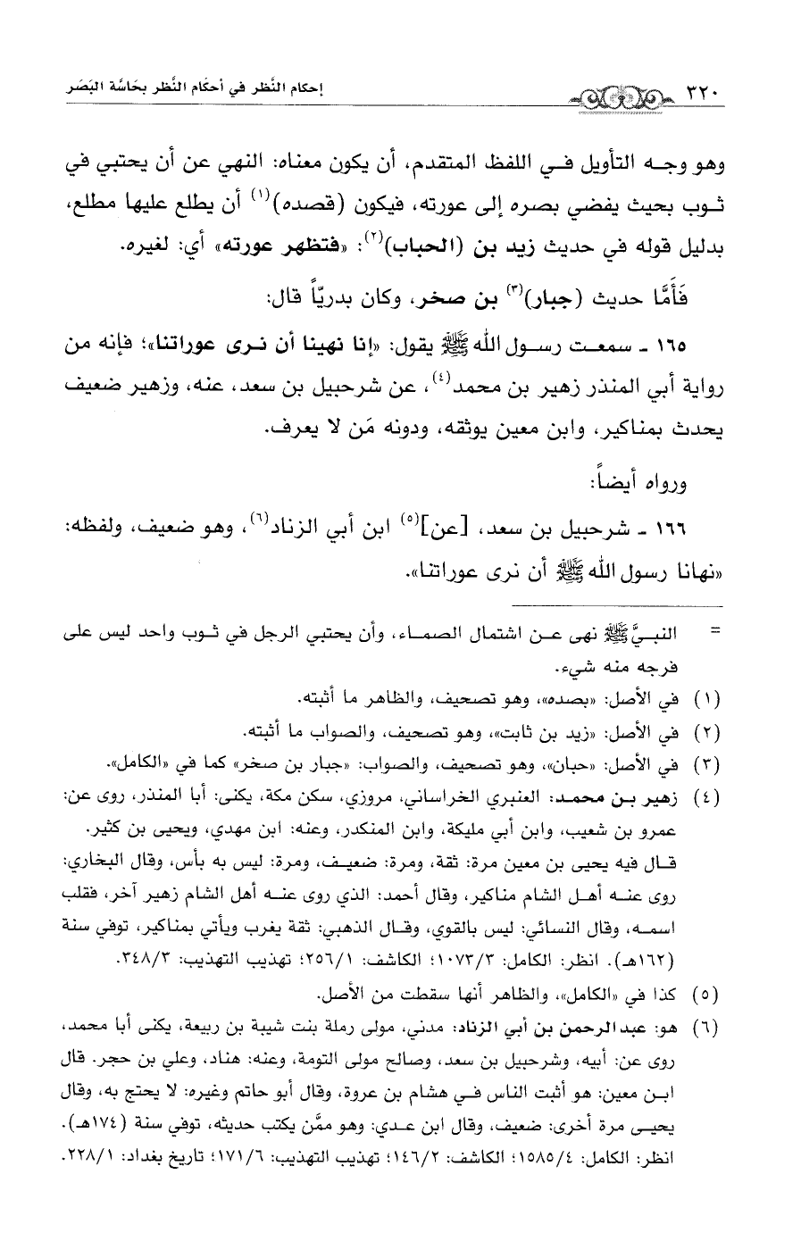 166 - شرحبيل بن سعد، [عن] (¬5) ابن أبي الزناد (¬6)، وهو ضعيف، ولفظه: "نهانا رسول الله - صلى الله عليه وسلم - أن نرى عوراتنا".