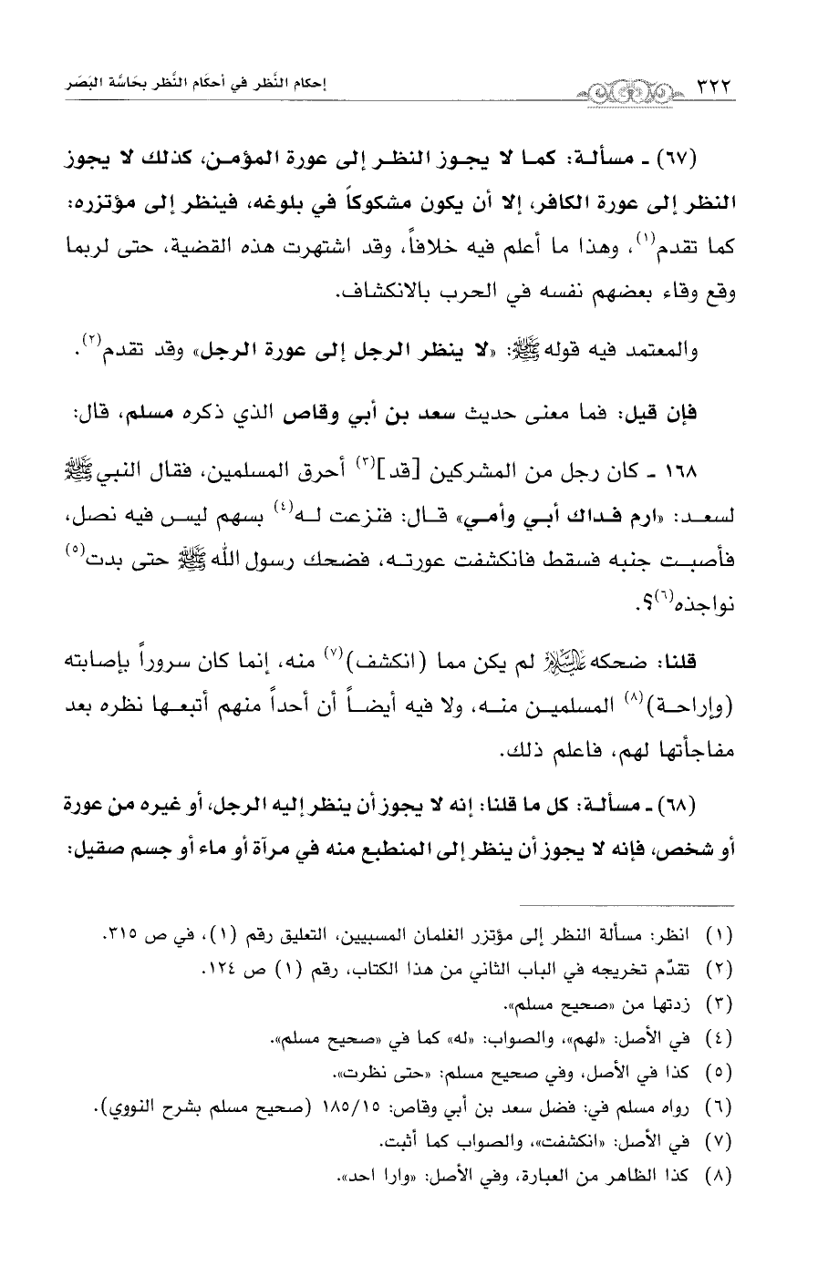 (68) - مسألة: كل ما قلنا: إنه لا يجوز أن ينظر إليه الرجل، أو غيره من عورة أو شخص، فإنه لا يجوز أن ينظر إلى المنطبع منه في مرآة أو ماء أو جسم صقيل: