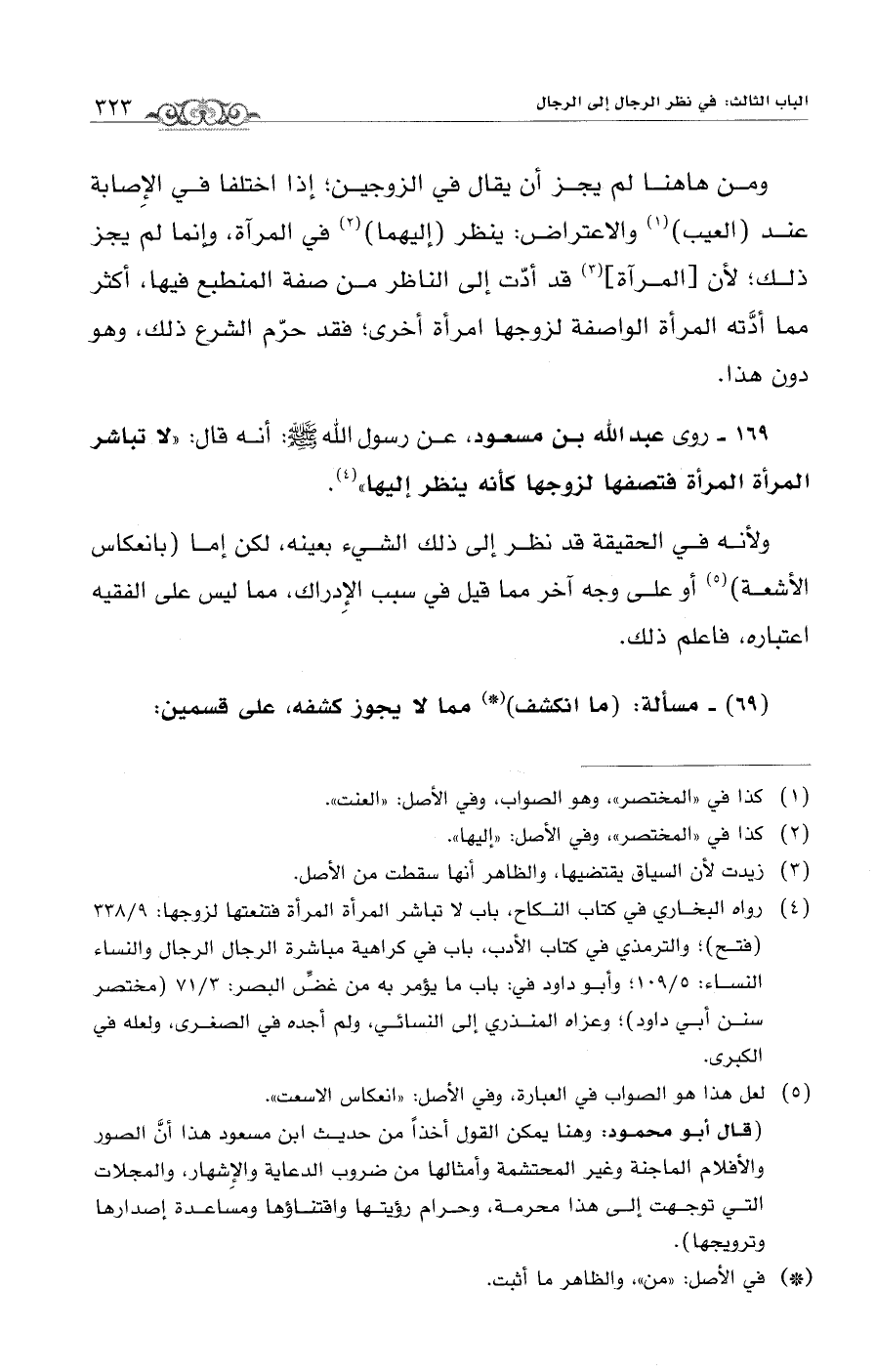 (قال أبو محمود: وهنا يمكن القول أخذًا من حديث ابن مسعود هذا أنَّ الصور والأفلام الماجنة وغير المحتشمة وأمثالها من ضروب الدعاية والإِشهار، والمجلات التي توجهت إلى هذا محرمة، وحرام رؤيتها واقتناؤها ومساعدة إصدارها وترويجها).