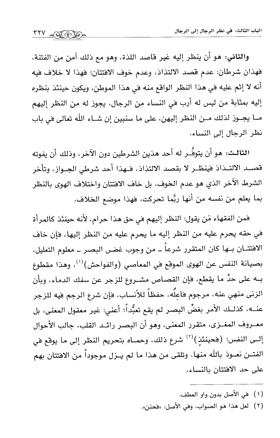 والثاني: هو أن ينظر إليه غير قاصد اللذة، وهو مع ذلك آمن من الفتنة، فهذان شرطان: عدم قصد الإلتذاذ، وعدم خوف الإفتتان، فهذا لا خلاف فيه أنه لا إثم عليه في هذا النظر الواقع منه في هذا الموطن، ويكون حينئذ بنظره إليه بمثابة من ليس له أرب في النساء من الرجال، يجوز له من النظر إليهم ما يجوز لذلك من النظر إليهن، على ما سنبين إن شاء الله تعالى في باب نظر الرجال إلى النساء.