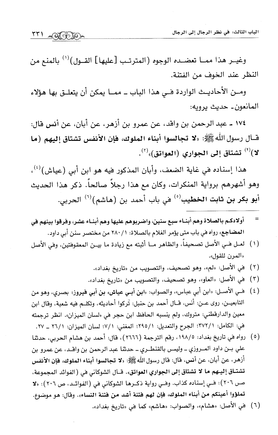 (¬5) رواه في تاريخ بغداد: 5/ 198، رقم الترجمة (2666)، قال: أحمد بن هشام الحربي، حدثنا علي بن داود المروزي -وليس بالقنطري- حدثنا عبد الرحمن بن واقد، عن عمرو بن أزهر، عن أبان، عن أنس، قال: قال رسول الله - صلى الله عليه وسلم -: "لا تجالسوا أبناء الملوك، فإن الأنفس تشتاق إليهم ما لا تشتاق إلى الجواري العواتق". قال الشوكاني في (الفوائد المجموعة، ص: 206): في إسناده كذاب. وفي رواية ذكرها الشوكاني في (الفوائد، ص: 206): "لا تملؤوا أعينكم من أبناء الملوك، فإن لهم فتنة أشد من فتنة النساء". وقال: هو موضوع.
