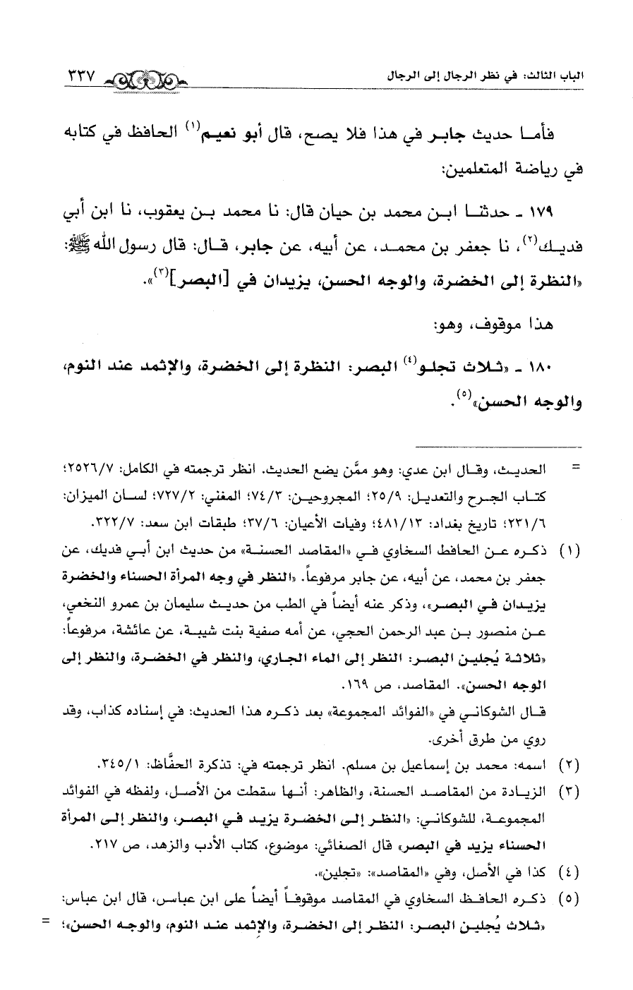 179 - حدثنا ابن محمد بن حيان قال: نا محمد بن يعقوب، نا ابن أبي فديك (¬2)، نا جعفر بن محمد، عن أبيه، عن جابر، قال: قال رسول الله - صلى الله عليه وسلم -: "النظرة إلى الخضرة، والوجه الحسن، يزيدان في [البصر] (¬3) ".