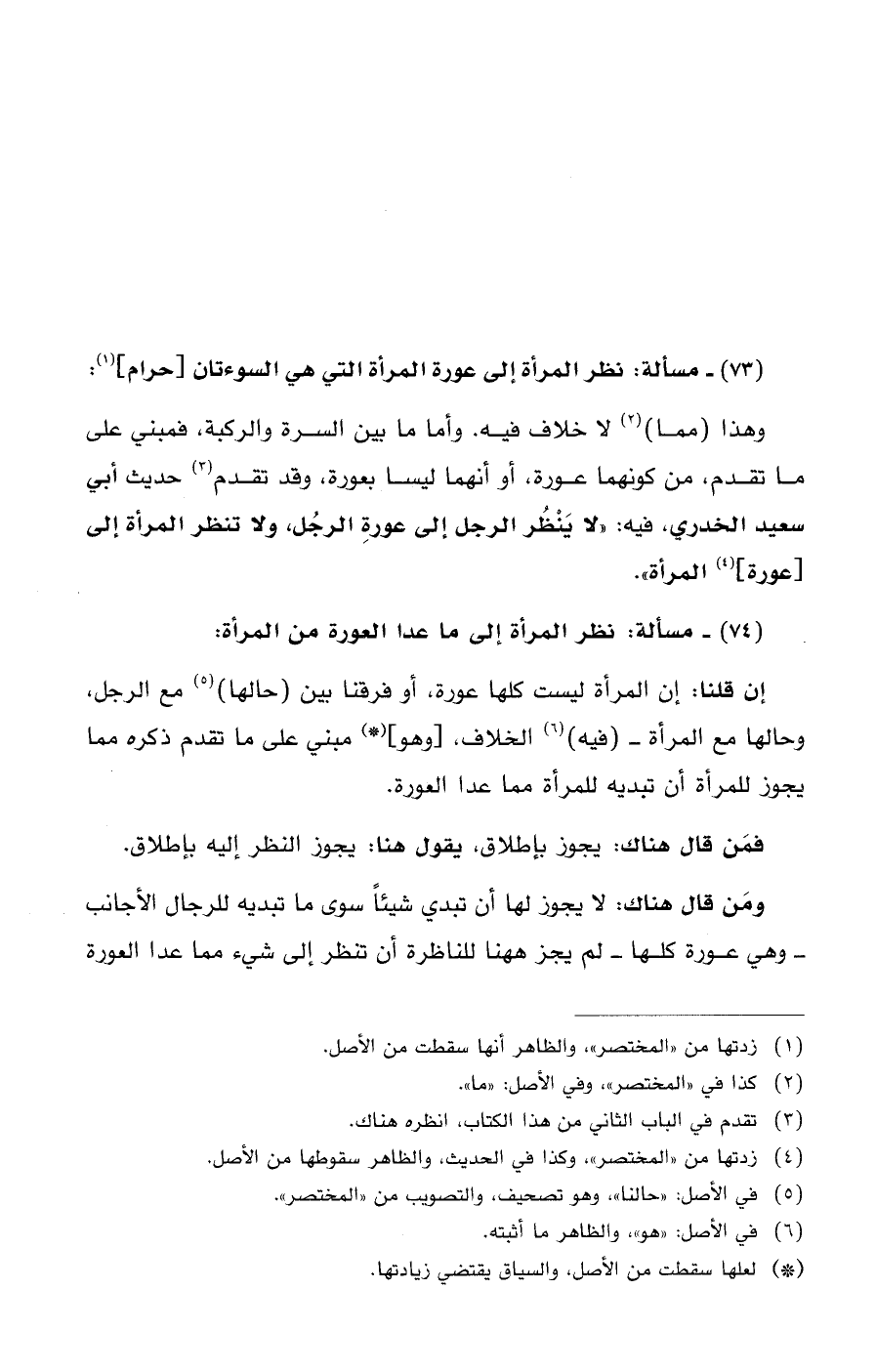 (73) - مسألة: نظر المرأة إلى عورة المرأة التي هي السوءتان [حرام] (¬1):