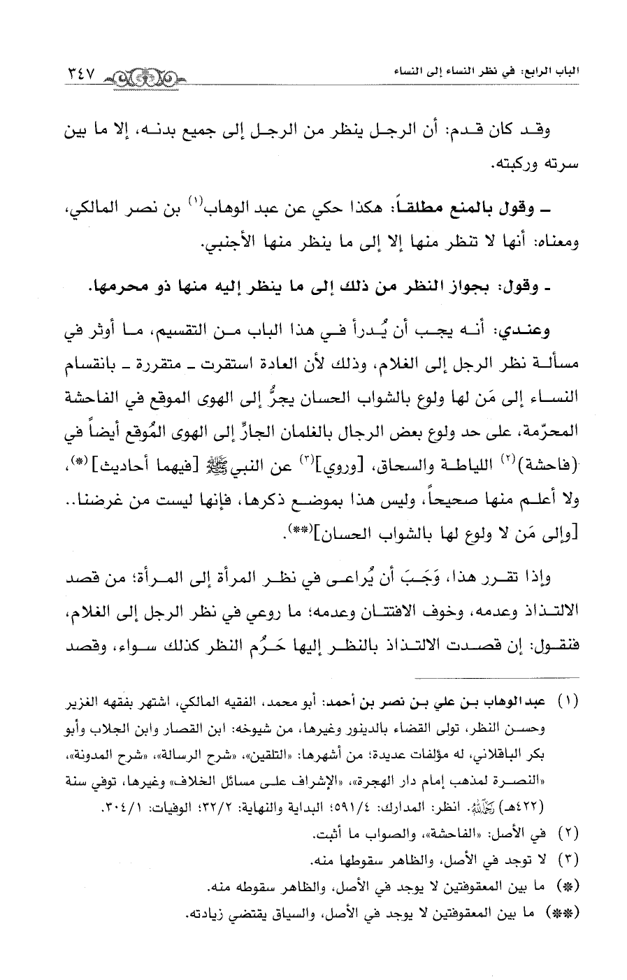 وعندي: أنه يجب أن يُدرأ في هذا الباب من التقسيم، ما أوثر في مسألة نظر الرجل إلى الغلام، وذلك لأن العادة استقرت -متقررة- بانقسام النساء إلى مَن لها ولوع بالشواب الحسان يجرُّ إلى الهوى الموقع في الفاحشة المحرّمة، على حد ولوع بعض الرجال بالغلمان الجارِّ إلى الهوى المُوقع أيضًا في (فاحشة) (¬2) اللياطة والسحاق، [وروي] (¬3) عن النبي - صلى الله عليه وسلم -[فيهما أحاديث] (*)، ولا أعلم منها صحيحًا، وليس هذا بموضع ذكرها، فإنها ليست من غرضنا .. [وإلى مَن لا ولوع لها بالشواب الحسان] (**).
