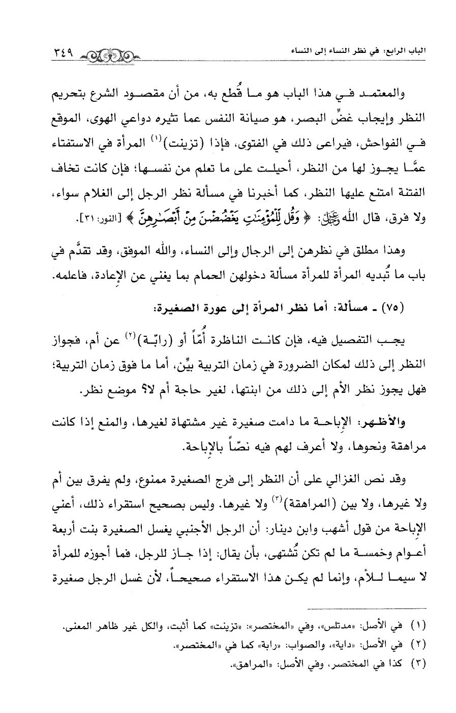 والمعتمد في هذا الباب هو ما قُطع به، من أن مقصود الشرع بتحريم النظر وإيجاب غضِّ البصر، هو صيانة النفس عما تثيره دواعي الهوى، الموقع في الفواحش، فيراعى ذلك في الفتوى، فإذا (تزينت) (¬1) المرأة في الاستفتاء عمَّا يجوز لها من النظر، أحيلت على ما تعلم من نفسها، فإن كانت تخاف الفتنة امتنع عليها النظر، كما أخبرنا في مسألة نظر الرجل إلى الغلام سواء، ولا فوق، قال الله -عَزَّ وَجَلَّ-: {وَقُلْ لِلْمُؤْمِنَاتِ يَغْضُضْنَ مِنْ أَبْصَارِهِنَّ} [النور: 31].