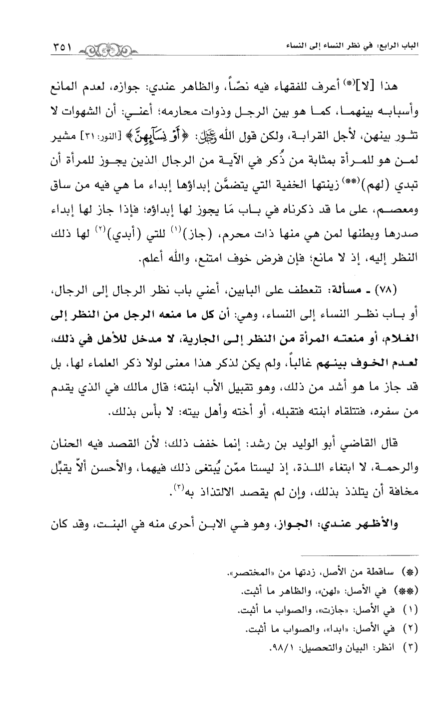 (78) - مسألة: تنعطف على البابين، أعني باب نظر الرجال إلى الرجال، أو باب نظر النساء إلى النساء، وهي: أن كل ما منعه الرجل من النظر إلى الغلام، أو منعته المرأة من النظر إلى الجارية، لا مدخل للأهل في ذلك، لعدم الخوف بينهم غالبًا، ولم يكن لذكر هذا معنى لولا ذكر العلماء لها، بل قد جاز ما هو أشد من ذلك، وهو تقبيل الأب ابنته، قال مالك في الذي يقدم من سفره، فتتلقاه ابنته فتقبله، أو أخته وأهل بيته: لا بأس بذلك.