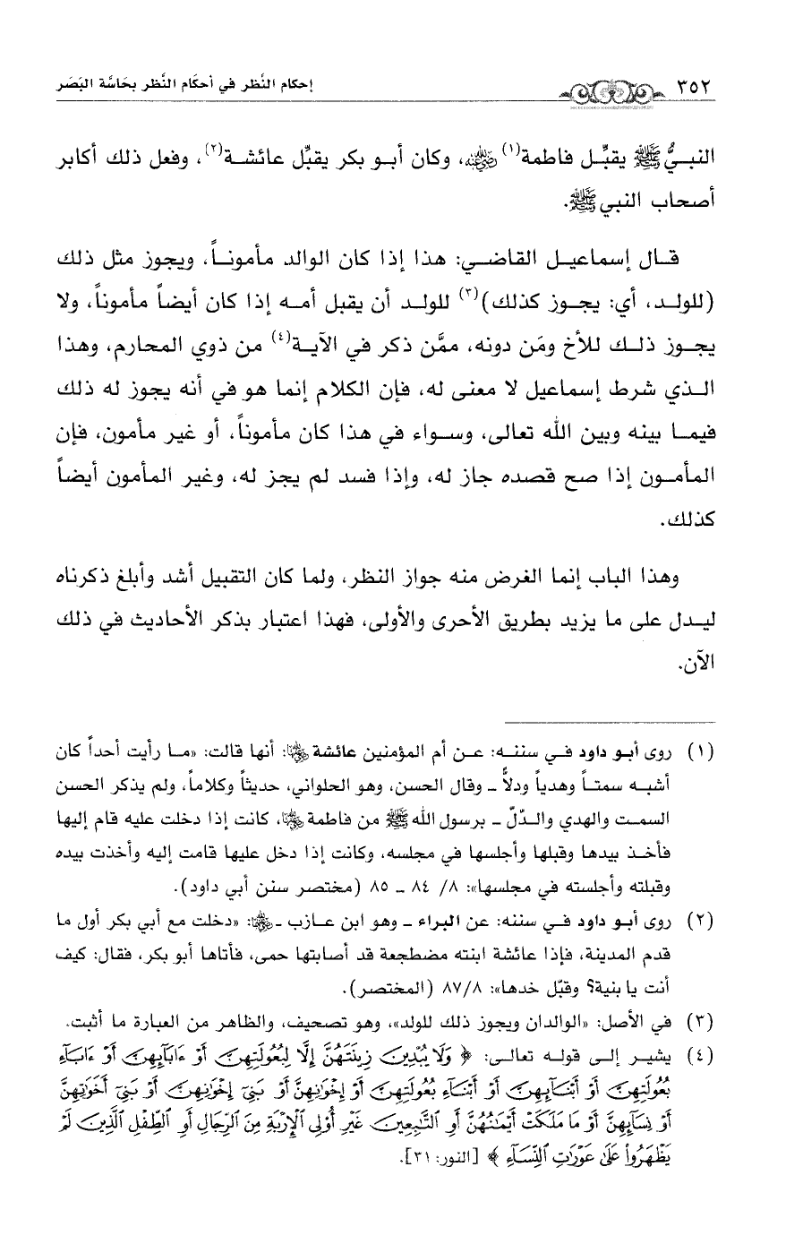 قال إسماعيل القاضي: هذا إذا كان الوالد مأموناً, ويجوز مثل ذلك (للولد، أي: يجوز كذلك) (¬3) للولد أن يقبل أمه إذا كان أيضاً مأموناً، ولا يجوز ذلك للأخ ومَن دونه، ممَّن ذكر في الآية (¬4) من ذوي المحارم، وهذا الذي شرط إسماعيل لا معنى له، فإن الكلام إنما هو في أنه يجوز له ذلك فيما بينه وبين الله تعالى، وسواء في هذا كان مأموناً، أو غير مأمون، فإن المأمون إذا صح قصده جاز له، واذا فسد لم يجز له، وغير المأمون أيضاً كذلك.