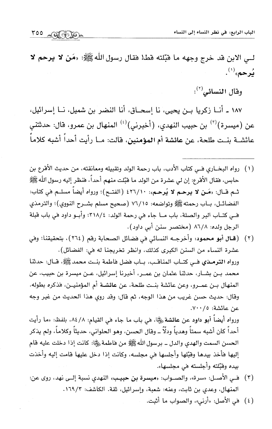 (¬1) رواه البخاري في كتاب الأدب، باب رحمة الولد وتقبيله ومعانقته، من حديث الأقرع بن حابس، فقال الأقرع: إن لي عشرة من الولد ما قبّلت منهم أحداً، فنظر إليه رسول الله - صلى الله عليه وسلم - ثم قال: "مَن لا يرحم لا يُرحم": 10/ 436 (الفتح)؛ ورواه أيضاً مسلم في كتاب: الفضائل، باب رحمته - صلى الله عليه وسلم - وتواضعه: 15/ 76 (صحيح مسلم بشرح النووي)؛ والترمذي في كتاب البر والصلة، باب ما جاء في رحمة الولد: 4/ 318؛ وأبو داود في باب قبلة الرجل ولده: 8/ 86 (مختصر سنن أبي داود).