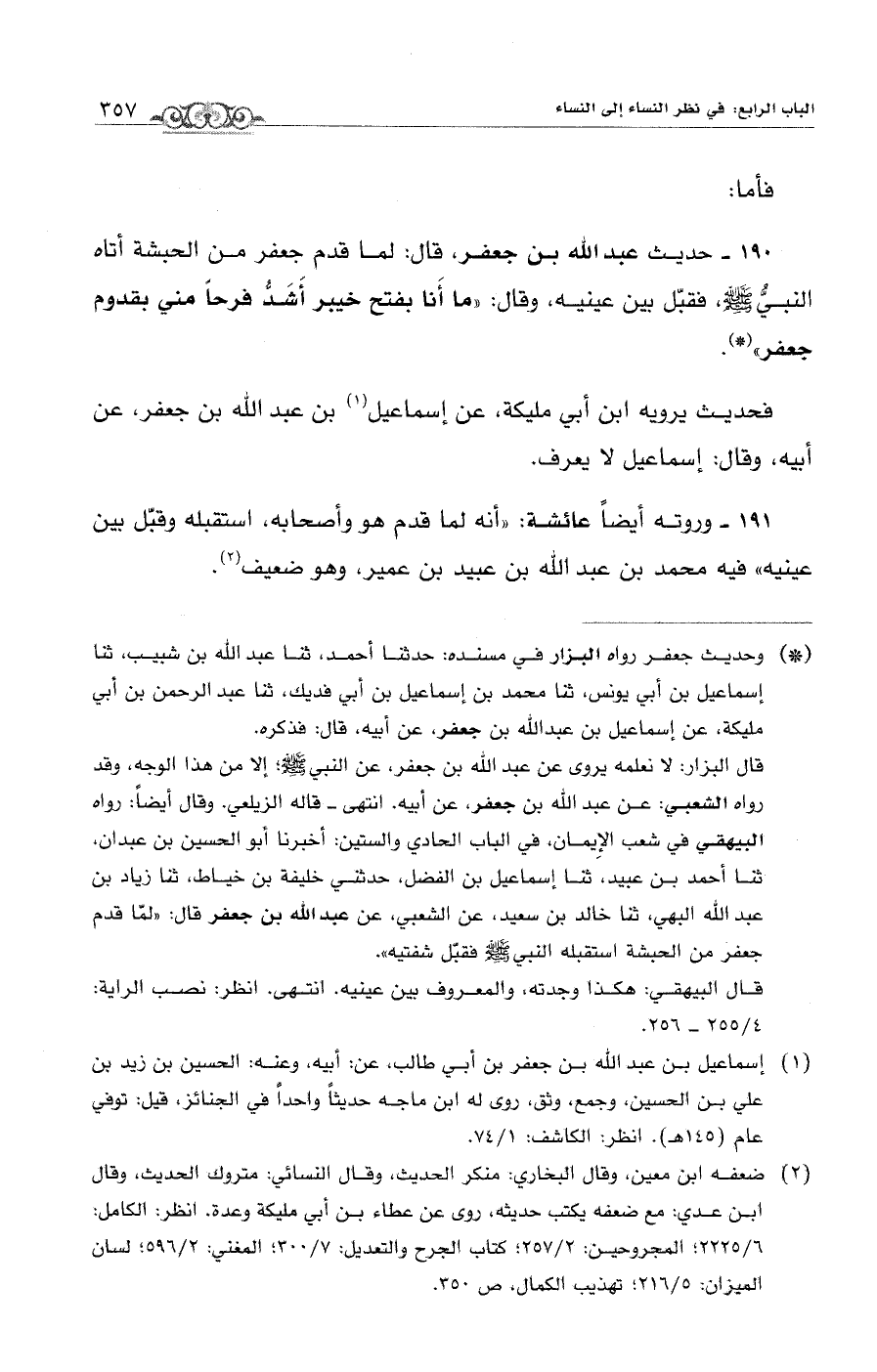 191 - وروته أيضاً عائشة: "أنه لما قدم هو وأصحابه، استقبله وقبّل بين عينيه" فيه محمد بن عبد الله بن عبيد بن عمير، وهو ضعيف (¬2).