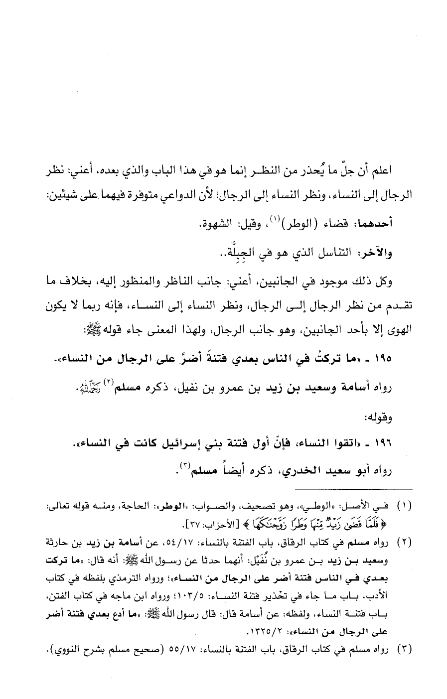 (¬2) رواه مسلم في كتاب الرقاق، باب الفتنة بالنساء: 17/ 54، عن أسامة بن زيد بن حارثة وسعيد بن زيد بن عمرو بن نُفَيل: أنهما حدثا عن رسول الله - صلى الله عليه وسلم -: أنه قال: "ما تركت بعدي في الناس فتنة أضر على الرجال من النساء": ورواه الترمذي بلفظه في كتاب الأدب، باب ما جاء في تحذير فتنة النساء: 5/ 103: ورواه ابن ماجه في كتاب الفتن، باب فتنة النساء، ولفظه: عن أسامة قال: قال رسول الله - صلى الله عليه وسلم -: "ما أدع بعدي فتنة أضر على الرجال من النساء": 3/ 1325.