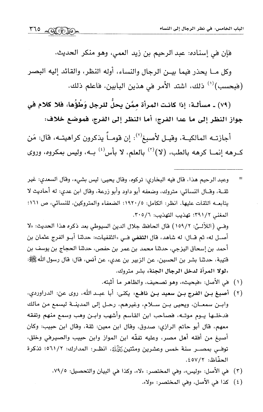(79) - مسألة: إذا كانت المرأة مِمَّن يحلُّ للرجل وَطْؤُها، فلا كلام في جواز النظر إلى ما عدا الفرج: أما النظر إلى الفرج، فموضع خلاف: