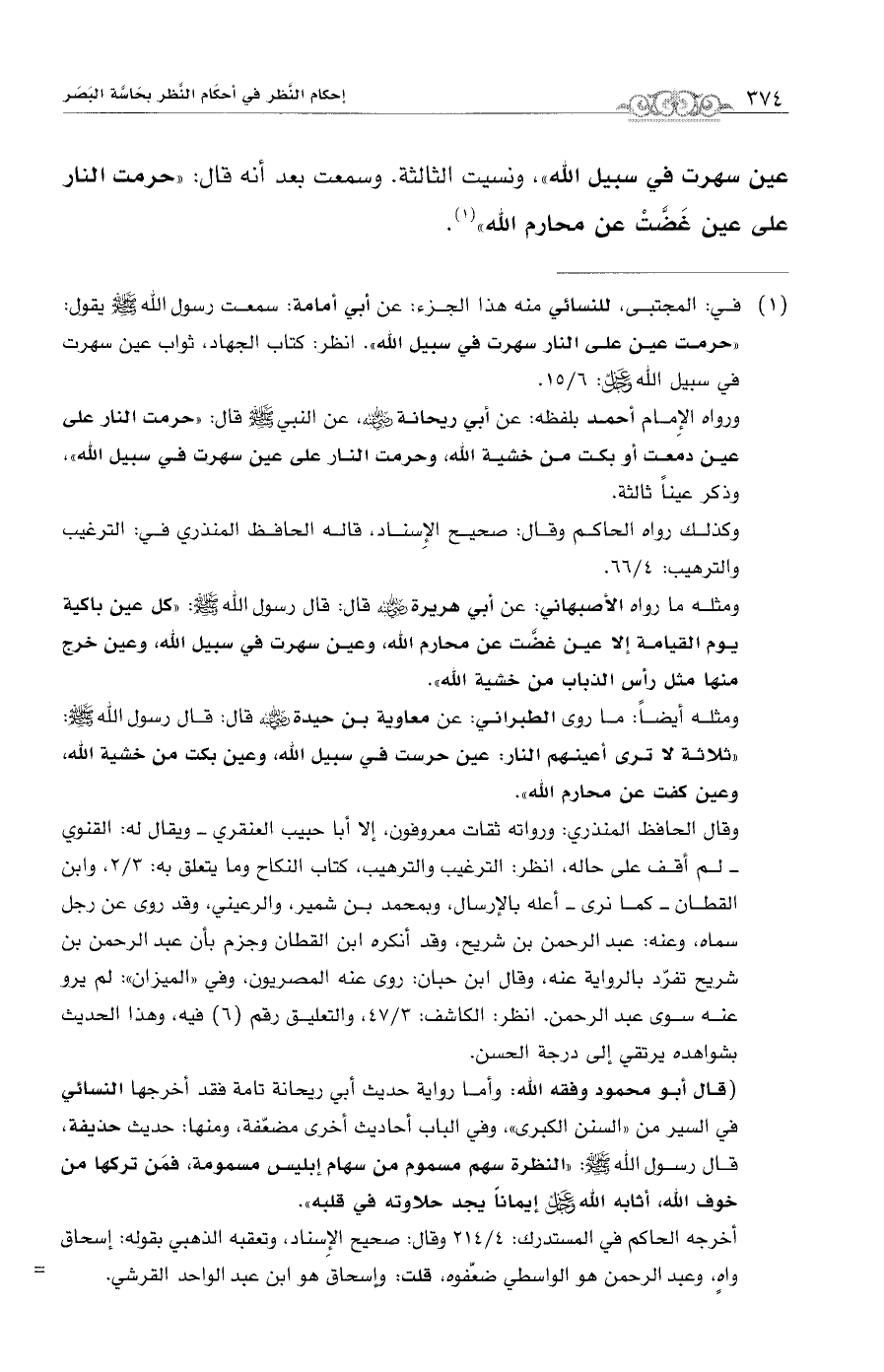 عين سهرت في سبيل الله"، ونسيت الثالثة. وسمعت بعد أنه قال: "حرمت النار عين غَضَّتْ عن محارم الله" (¬1).
