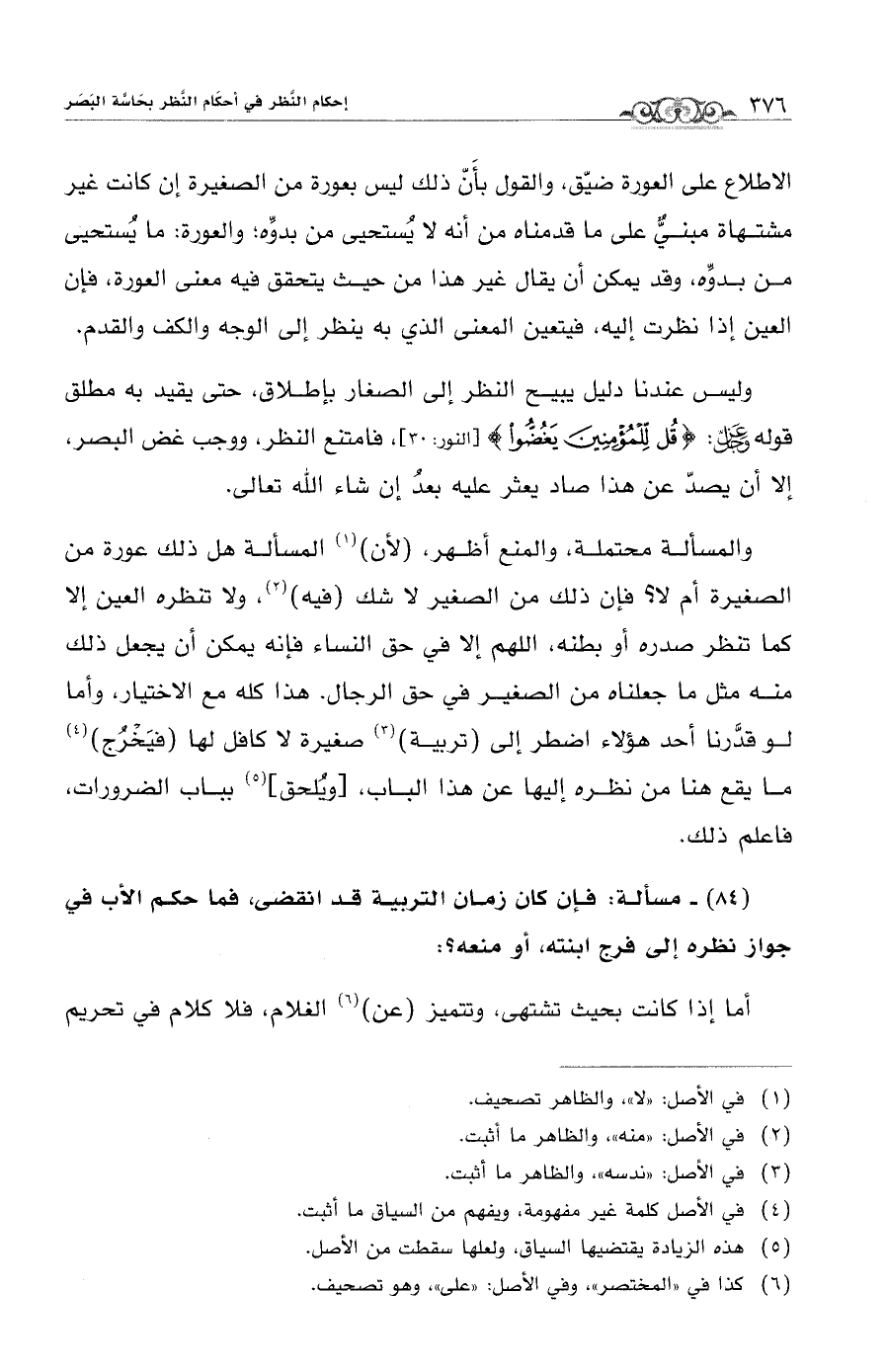 وليس عندنا دليل يبيح النظر إلى الصغار بإطلاق، حتى يقيد به مطلق قوله -عَزَّ وَجَلَّ- {قُلْ لِلْمُؤْمِنِينَ يَغُضُّوا} [النور: 30]، فامتنع النظر، ووجب غض البصر، إلا أن يصدّ عن هذا صاد يعثر عليه بعدُ إن شاء الله تعالى.