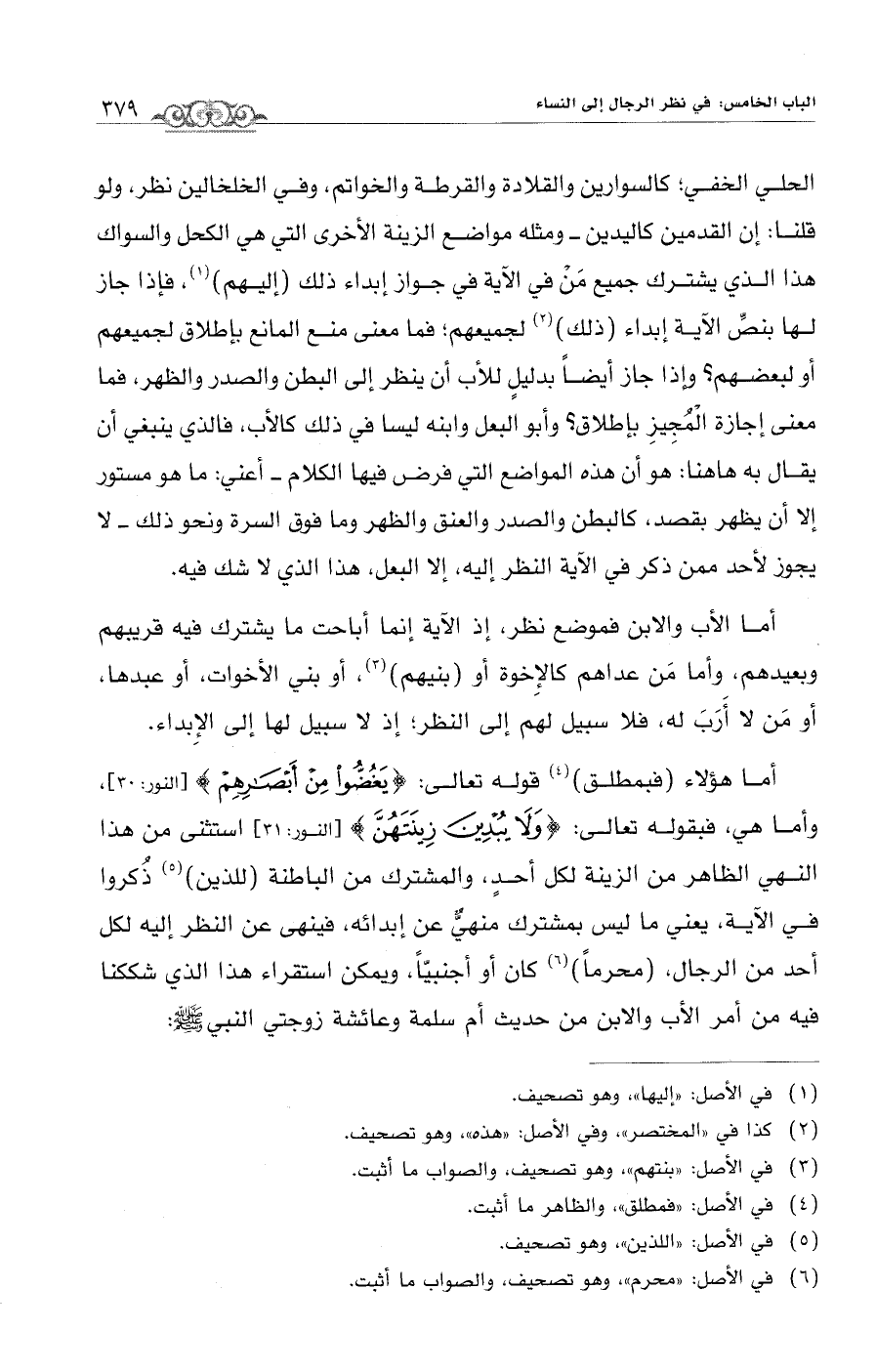 أما هؤلاء (فبمطلق) (¬4) قوله تعالى: {يَغُضُّوا مِنْ أَبْصَارِهِمْ} [النور: 30]، وأما هي، فبقوله تعالى: {وَلَا يُبْدِينَ زِينَتَهُنَّ} [النور: 31] استثنى من هذا النهي الظاهر من الزينة لكل أحدٍ، والمشترك من الباطنة (للذين) (¬5) ذُكروا في الآية، يعني ما ليس بمشترك منهيٌّ عن إبدائه، فينهى عن النظر إليه لكل أحد من الرجال، (محرماً) (¬6) كان أو أجنبيّاً، ويمكن استقراء هذا الذي شككنا فيه من أمر الأب والابن من حديث أم سلمة وعائشة زوجتي النبي - صلى الله عليه وسلم -: