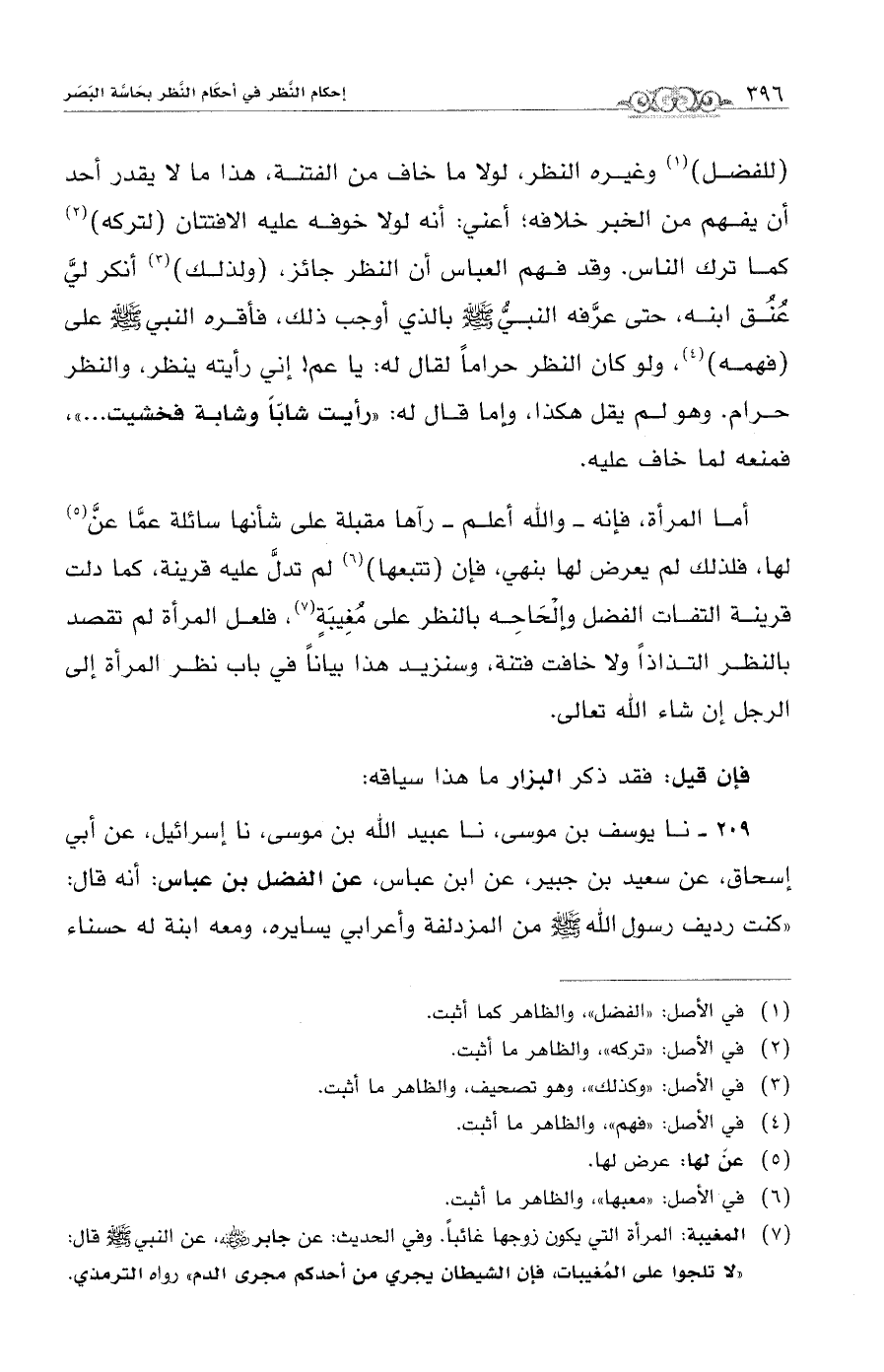 أما المرأة، فإنه -والله أعلم- رآها مقبلة على شأنها سائلة عمَّا عنَّ (¬5) لها، فلذلك لم يعرض لها بنهي، فإق (تتبعها) (¬6) لم تدلَّ عليه قرينة، كما دلت قرينة التفات الفضل وإلحَاحِه بالنظر على مُغِيبَةٍ (¬7)، فلعل المرأة لم تقصد بالنظر التذاذاً ولا خافت فتنة، وسنزيد هذا بياناً في باب نظر المرأة إلى الرجل إن شاء الله تعالى.