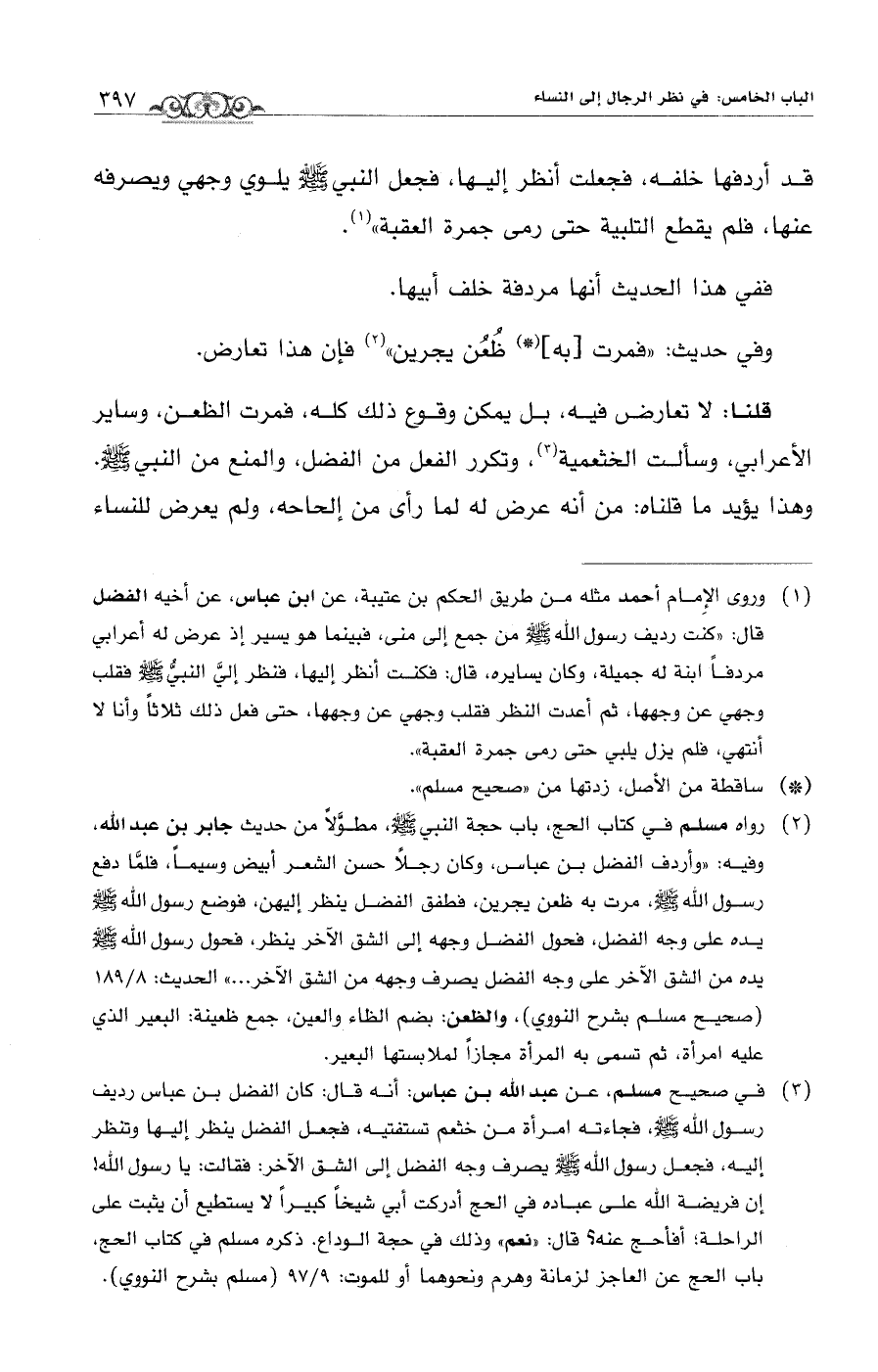 (¬2) رواه مسلم في كتاب الحج، باب حجة النبي - صلى الله عليه وسلم -، مطوَّلاً من حديث جابر بن عبد الله، وفيه: "وأردف الفضل بن عباس، وكان رجلاً حسن الشعر أبيض وسيماً، فلمَّا دفع رسول الله - صلى الله عليه وسلم -، مرت به ظعن يجرين، فطفق الفضل ينظر إليهن، فوضع رسول الله - صلى الله عليه وسلم - يده على وجه الفضل، فحول الفضل وجهه إلى الشق الآخر ينظر، فحول رسول الله - صلى الله عليه وسلم - يده من الشق الآخر على وجه الفضل يصرف وجهه من الشق الآخر ... " الحديث: 8/ 189 (صحيح مسلم بشرح النووي)، والظعن: بضم الظاء والعين، جمع ظعينة: البعير الذي عليه امرأة, ثم تسمى به المرأة مجازاً لملابستها البعير.