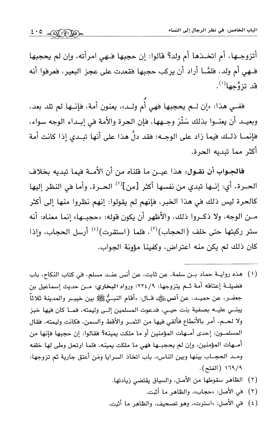 فالجواب أن نقول: هذا عين ما قلناه من أن الأمة فيما تبديه بخلاف الحرة، أي: إنها تبدي من نفسها أكثر [من] (¬2) الحرة، وأما في النظر إليها كالحرة ليس ذلك في هذا الخبر، فإنهم لم يقولوا: إنهم نظروا منها إلى أكثر من الوجه، ولا ذكروا ذلك، والأظهر أن يكون قوله: "حجبها" إنما معناه: أنه ستر ركبتها حتى خلف (الحجاب) (¬3)، فلما (استقرت) (¬4) أرسل الحجاب، وإذا كان ذلك لم يكن منه اعتراض، وكفينا مؤونة الجواب.