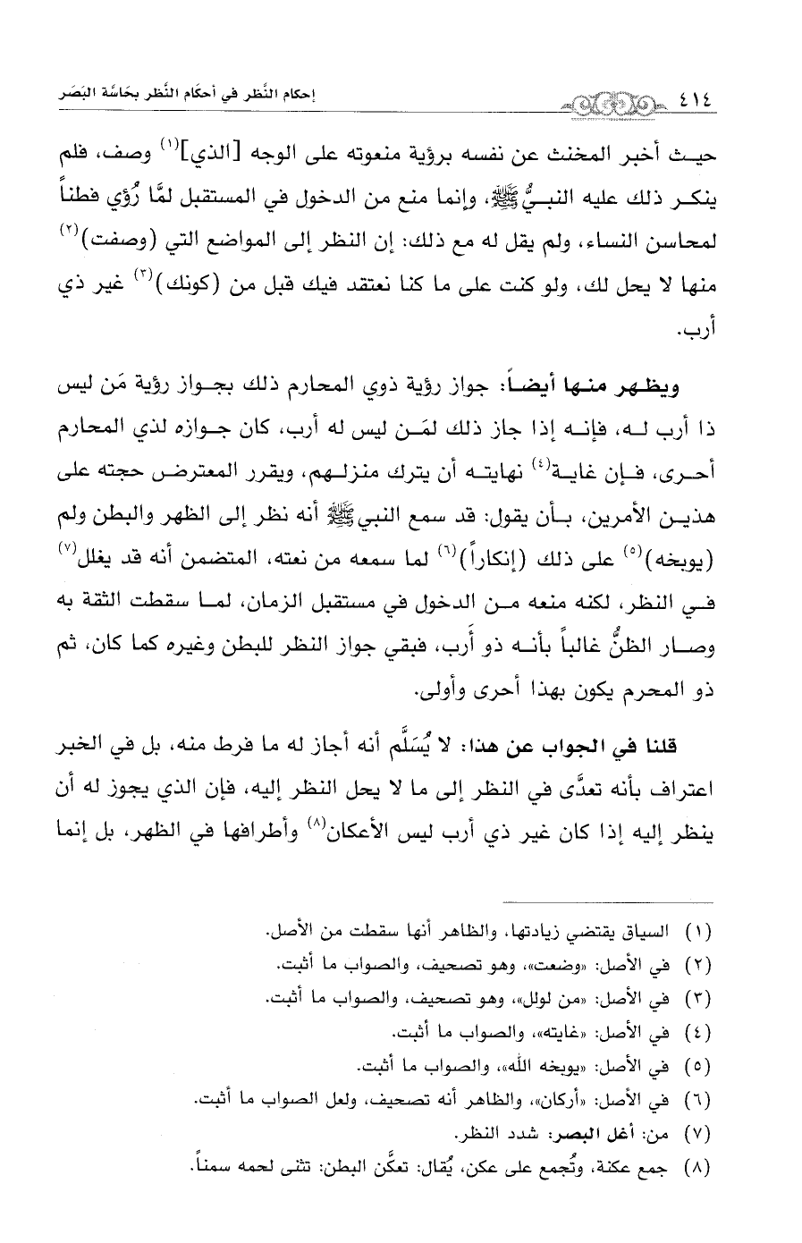 قلنا في الجواب عن هذا: لا يُسَلَّم أنه أجاز له ما فرط منه، بل في الخبر اعتراف بأنه تعدَّى في النظر إلى ما لا يحل النظر إليه، فإن الذي يجوز له أن ينظر إليه إذا كان غير ذي أرب ليس الأعكان (¬8) وأطرافها في الظهر، بل إنما
