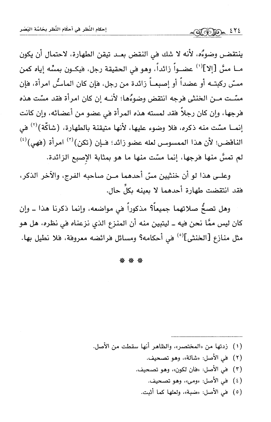 ينتقض وضوءُه، لأنه لا شك في النقض بعد تيقن الطهارة، لاحتمال أن يكون ما مسَّ [إلا] (¬1) عضواً زائداً، وهو في الحقيقة رجل، فيكون بمسِّه إياه كمن مسّ ركبته أو عضداً أو إصبعاً زائدة من رجل، فإن كان الماسُّ امرأة، فإن مسّت من الخنثى فرجه انتقض وضوءُها؛ لأنه إن كان امرأة فقد مسّت هذه فرجها، وإن كان رجلاً فقد لمسته هذه المرأة في عضو من أعضائه، وإن كانت إنما مسّت منه ذكره، فلا وضوء عليها، لأنها متيقنة بالطهارة، (شاكّة) (¬2) في الناقض؛ لأن هذا الممسوس لعله عضو زائد؛ فإن (تكن) (¬3) امرأة (فهي) (¬4) لم تمسَّ منها فرجها، إنما مسّت منها ما هو بمثابة الإِصبع الزائدة.