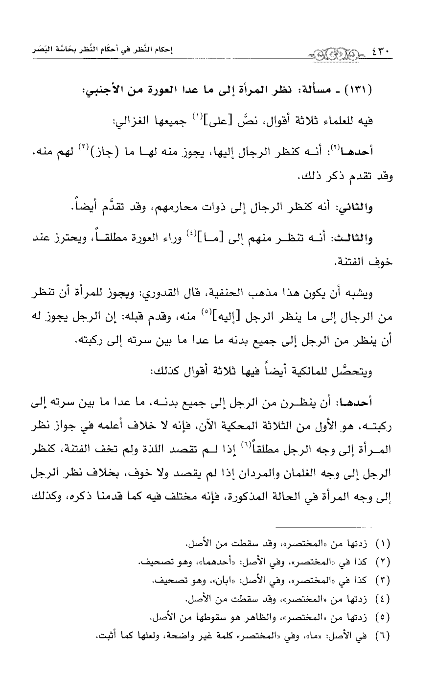 (131) - مسألة: نظر المرأة إلى ما عدا العورة من الأجنبي: