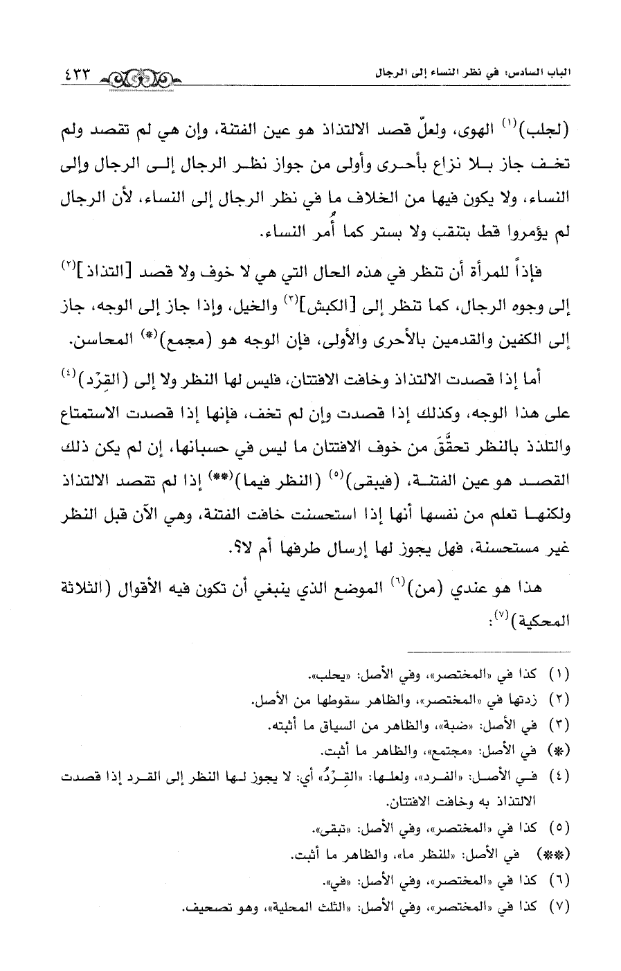 (لجلب) (¬1) الهوى، ولعلّ قصد الإلتذاذ هو عين الفتنة، وإن هي لم تقصد ولم تخف جاز بلا نزاع بأحرى وأولى من جواز نظر الرجال إلى الرجال وإلى النساء، ولا يكون فيها من الخلاف ما في نظر الرجال إلى النساء، لأن الرجال لم يؤمروا قط بتنقب ولا بستر كما أُمر النساء.