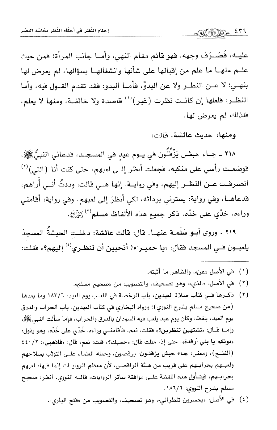 (¬3) ذكرها في كتاب صلاة العيدين، باب الرخصة في اللعب يوم العيد: 6/ 183 وما بعدها (من صحيح مسلم بشرح النووي)؛ ورواه البخاري في كتاب العيدين، باب الحراب والدرق يوم العيد، بلفظ: وكان يوم عيد يلعب فيه السودان بالدرق والحواب، فإما سألت النبي - صلى الله عليه وسلم -، وإما قال: "تشتهين تنظرين؟ " فقلت: نعم، فأقامني وراءه، خَدّي على خَدّه، وهو يقول: "دونكم يا بني أرفدة"، حتى إذا مللت قال: "حسبك؟ " قلت: نعم، قال: "فاذهبي": 2/ 440 (الفتح)، ومعنى: جاء حبش يزفنون: يرقصون، وحمله العلماء على التوثب بسلاحهم ولعبهم بحرابهم على قريب من هيئة الراقص، لأن معظم الروايات إنما فيها: لعبهم بحرابيم، فيتأول هذه اللفظة على موافقة سائر الروايات، قاله النووي. انظر: صحيح مسلم بشرح النووي: 6/ 186.