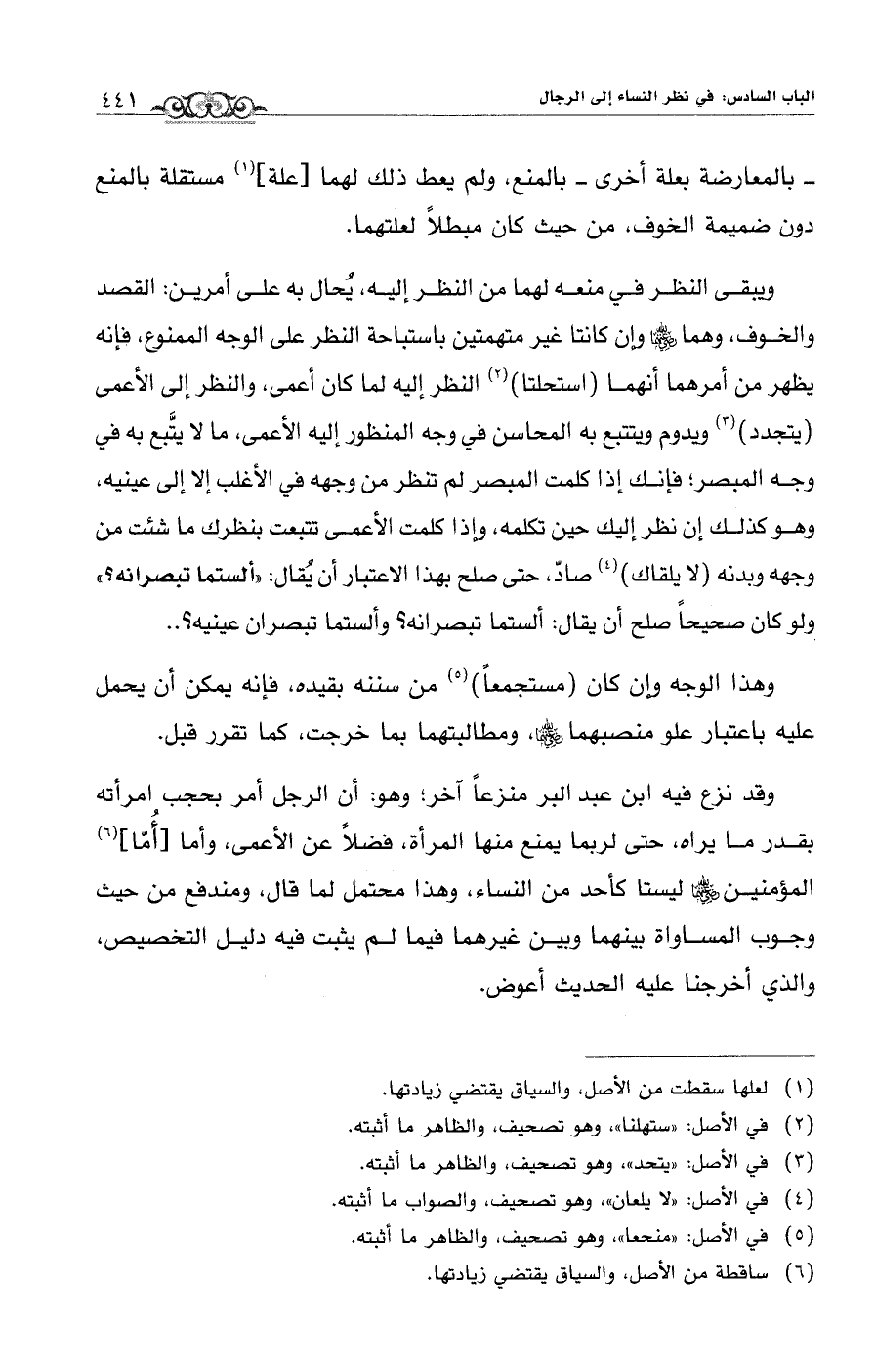 ويبقى النظر في منعه لهما من النظر إليه، يُحال به على أمرين: القصد والخوف، وهما - رضي الله عنهما - وإن كانتا غير متهمتين باستباحة النظر على الوجه الممنوع، فإنه يظهر من أمرهما أنهما (استحلتا) (¬2) النظر إليه لما كان أعمى، والنظر إلى الأعمى (يتجدد) (¬3) ويدوم ويتتبع به المحاسن في وجه المنظور إليه الأعمى، ما لا يتَّبع به في وجه المبصرة فإنك إذا كلمت المبصر لم تنظر من وجهه في الأغلب إلا إلى عينيه، وهو كذلك إن نظر إليك حين تكلمه، وإذا كلمت الأعمى تتبعت بنظرك ما شئت من وجهه وبدنه (لا يلقاك) (¬4) صادّ، حتى صلح بهذا الاعتبار أن يُقال: "ألستما تبصرانه؟ " ولو كان صحيحاً صلح أن يقال: ألستما تبصرانه؟ وألستما تبصران عينيه؟ ..