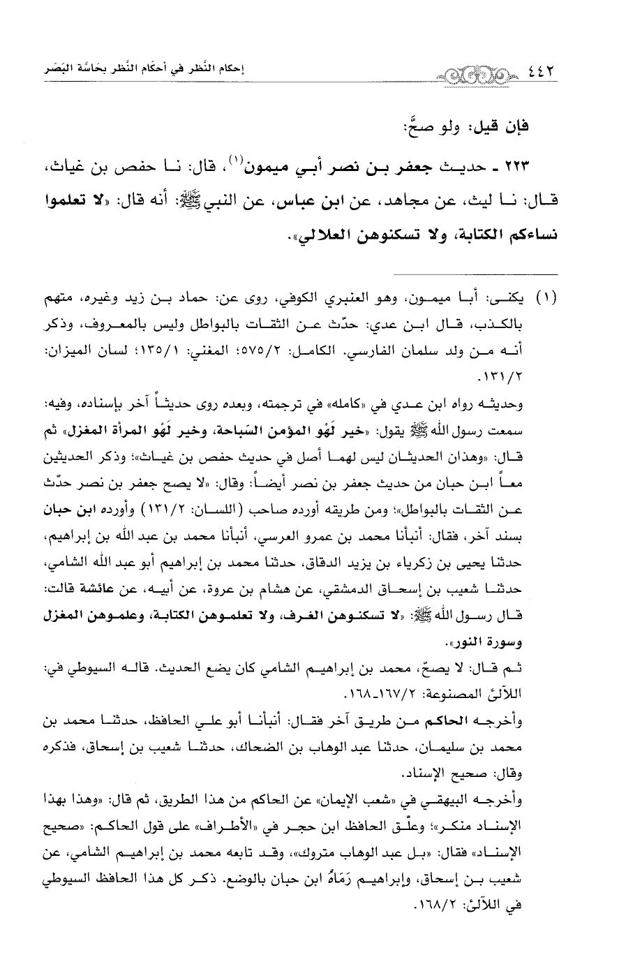 223 - حديث جعفر بن نصر أبي ميمون (¬1)، قال: نا حفص بن غياث، قال: نا ليث، عن مجاهد، عن ابن عباس، عن النبي - صلى الله عليه وسلم -: أنه قال: "لا تعلموا نساءكم الكتابة، ولا تسكنوهن العلالي".
