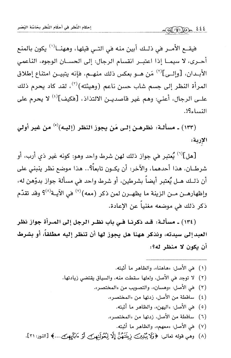 (134) - مسألة: قد ذكرنا في باب نظر الرجل إلى المرأة جواز نظر العبد إلى سيدته، ونذكر ههنا هل يجوز لها أن تنطر إليه مطلقاً، أو بشرط أن يكون لا منطر له؟:
