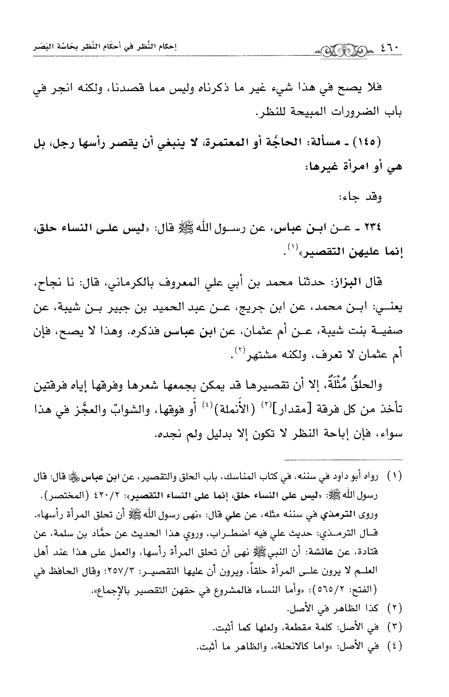 234 - عن ابن عياس، عن رسول الله - صلى الله عليه وسلم - قال: "ليس على النساء حلق، إنما عليهن التقصير" (¬1).