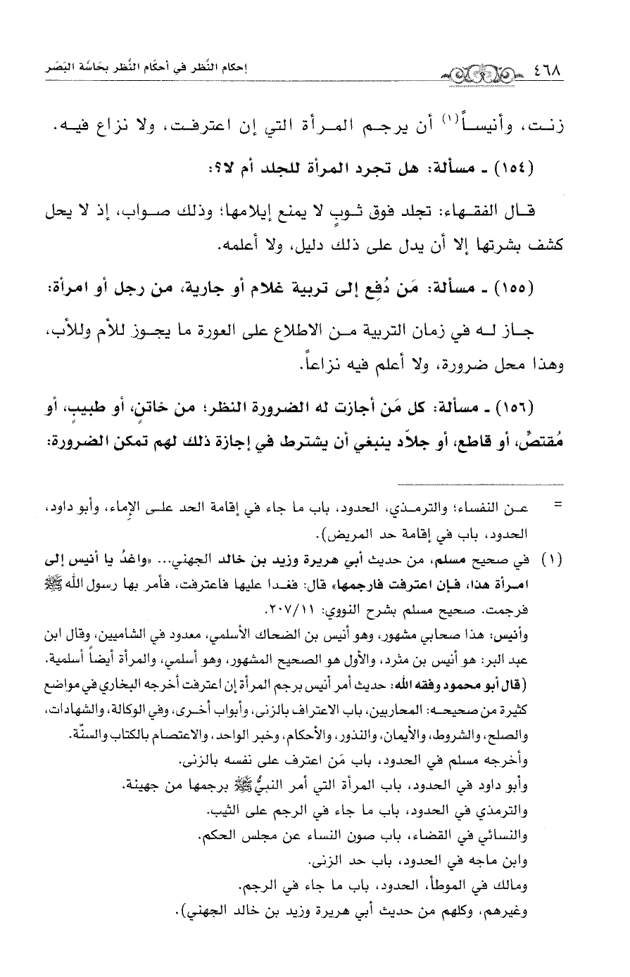 وأنيس: هذا صحابي مشهور، وهو أنيس بن الضحاك الأسلمي، معدود في الشاميين، وقال ابن عبد البر: هو أنيس بن مثرد، والأول هو الصحيح المشهور، وهو أسلمي، والمرأة أيضًا أسلمية. (قال أبو محمود وفقه الله: حديث أمر أنيس برجم المرأة إن اعترفت أخرجه البخاري في مواضع كلثيرة من صحيحه: المحاربين، باب الإعتراف بالزنى، " أبواب أخرى، وفي الوكالة، والشهادات، والصلح، والشروط، والأيمان، والنذور، والأحكام، وخبر الواحد، والإعتصام بالكتاب والسنّة.