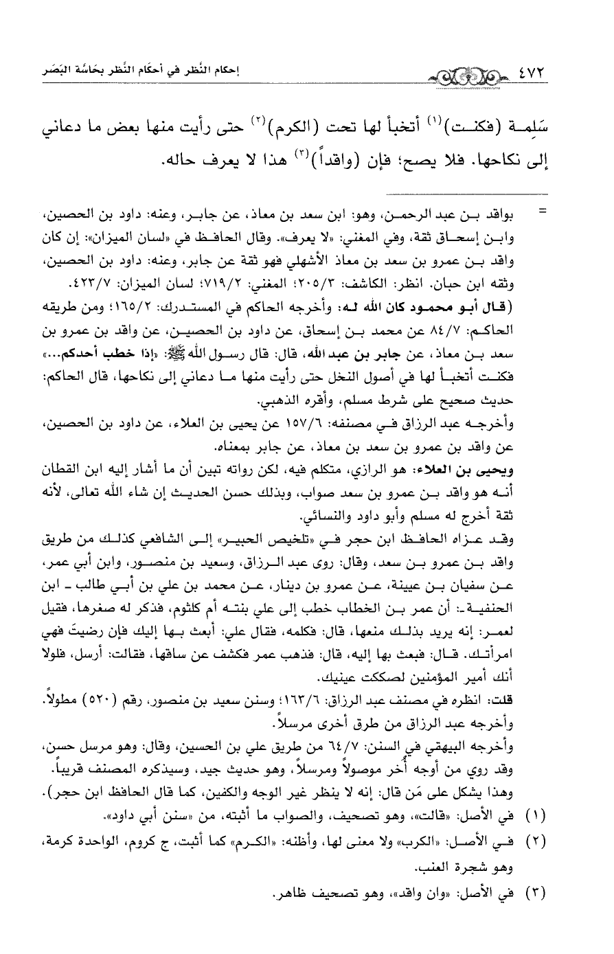 سَلِمة (فكنت) (¬1) أتخبأ لها تحت (الكرم) (¬2) حتى رأيت منها بعض ما دعاني إلى نكاحها. فلا يصح؛ فإن (واقدًا) (¬3) هذا لا يعرف حاله.