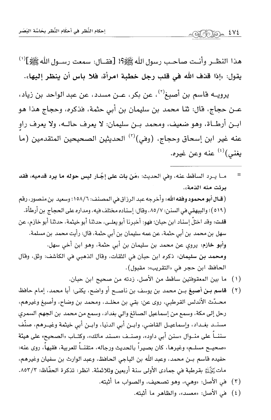 (¬2) قاسم بن أصبغ بن محمد بن يوسف بن ناصح أو واضح، يكنى: أبا محمد، إمام حافظ محدّث الأندلس القرطبي، روى عن: بقي بن مخلد، ومحمد بن وضاح، وأصبغ وغيرهم، رحل إلى مكة، وسمع من إسماعيل الصائغ والي بغداد، وسمع من محمد بن الجهم السمري مسند بغداد، واسماعيل القاضي، وابن أبي الدنيا، وابن أبي خيثمة وغيرهم، صنّف سننًا على منوال "سنن أبي داود"، وصنف "مسند مالك"، وكتاب "الصحيح" على هيئة