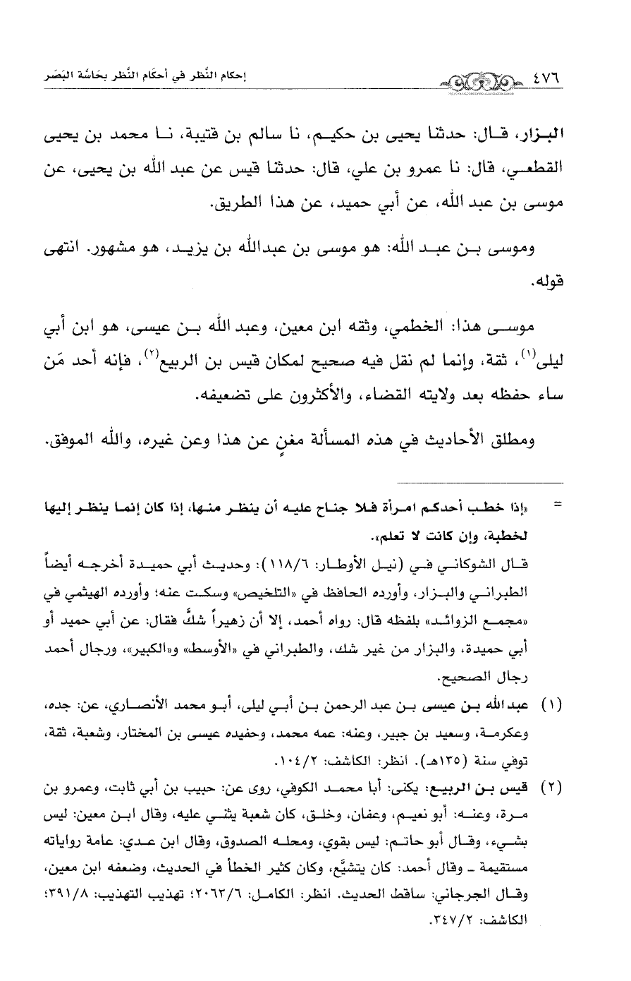 موسى هذا: الخطمي، وثقه ابن معين، وعبد الله بن عيسى، هو ابن أبي ليلى (¬1)، ثقة، وإنما لم نقل فيه صحيح لمكان قيس بن الربيع (¬2)، فإنه أحد مَن ساء حفظه بعد ولايته القضاء، والأكثرون على تضعيفه.