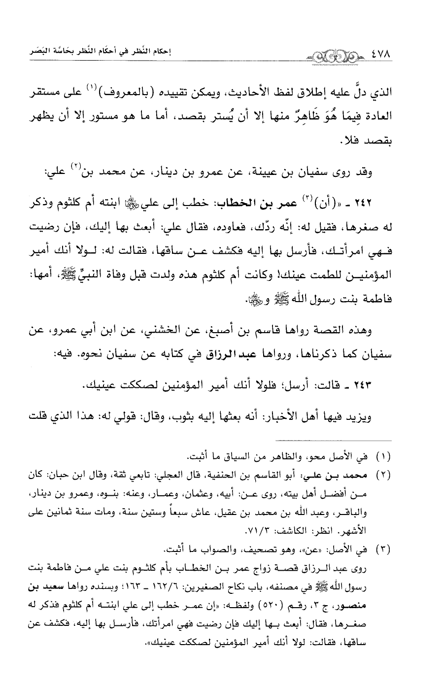 روى عبد الرزاق قصة زواج عمر بن الخطاب بأم كلثوم بنت علي من فاطمة بنت رسول الله - صلى الله عليه وسلم - في مصنفه، باب نكاح الصغيرين: 6/ 162 - 163؛ وبسنده رواها سعيد بن منصور، ج 3، رقم (520) ولفظه: "إن عمر خطب إلى علي ابنته أم كلثوم فذكر له صغرها، فقال: أبعث بها إليك فإن رضيت فهي امرأتك، فأرسل بها إليه، فكشف عن ساقها، فقالت: لولا أنك أمير المؤمنين لصككت عينيك".