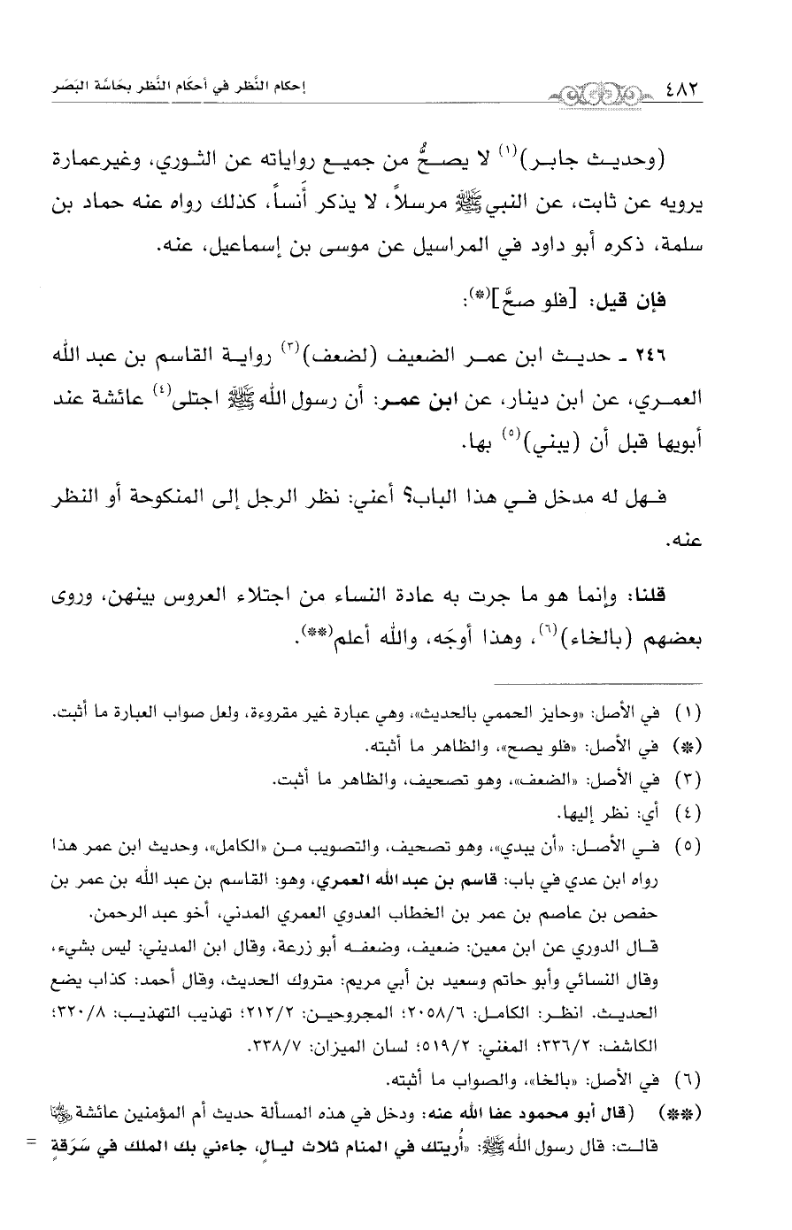 246 - حديث ابن عمر الضعيف (لضعف) (¬2) رواية القاسم بن عبد الله العمري، عن ابن دينار، عن ابن عمر: أن رسول الله - صلى الله عليه وسلم - اجتلى (¬3) عائشة عند أبويها قبل أن (يبني) (¬4) بها.