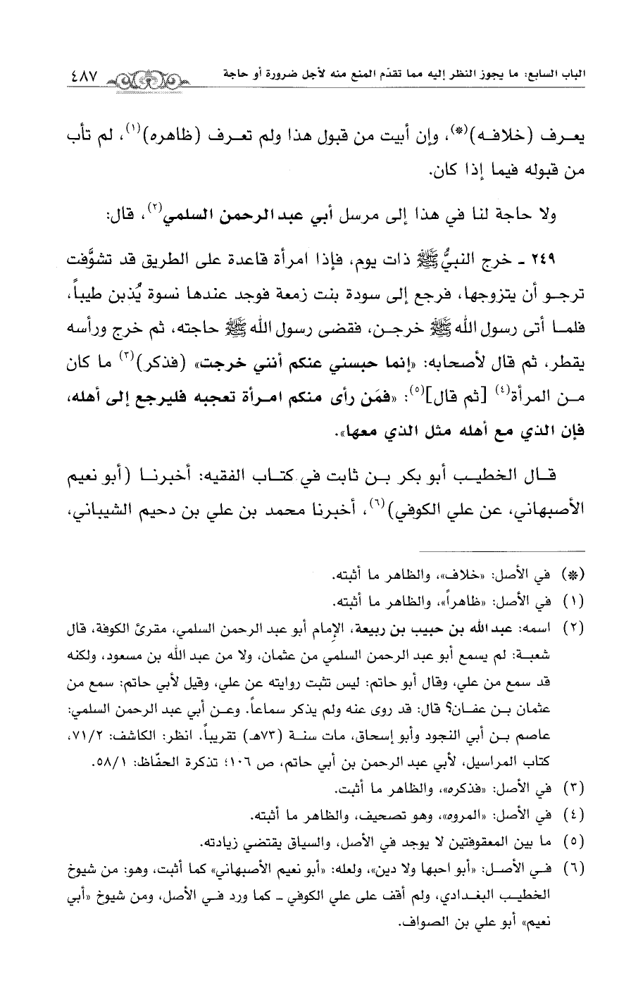 249 - خرج النبيُّ - صلى الله عليه وسلم - ذات يوم، فإذا امرأة قاعدة على الطريق قد تشوَّفت ترجو أن يتزوجها، فرجع إلى سودة بنت زمعة فوجد عندها نسوة يُذبن طيبًا، فلما أتى رسول الله - صلى الله عليه وسلم - خرجن، فقضى رسول الله - صلى الله عليه وسلم - حاجته، ثم خرج ورأسه يقطر، ثم قال لأصحابه: "إنما حبسني عنكم أنني خرجت" (فذكر) (¬3) ما كان من المرأة (¬4) [ثم قال] (¬5): "فمَن رأى منكم امرأة تعجبه فليرجع إلى أهله، فإن الذي مع أهله مثل الذي معها".