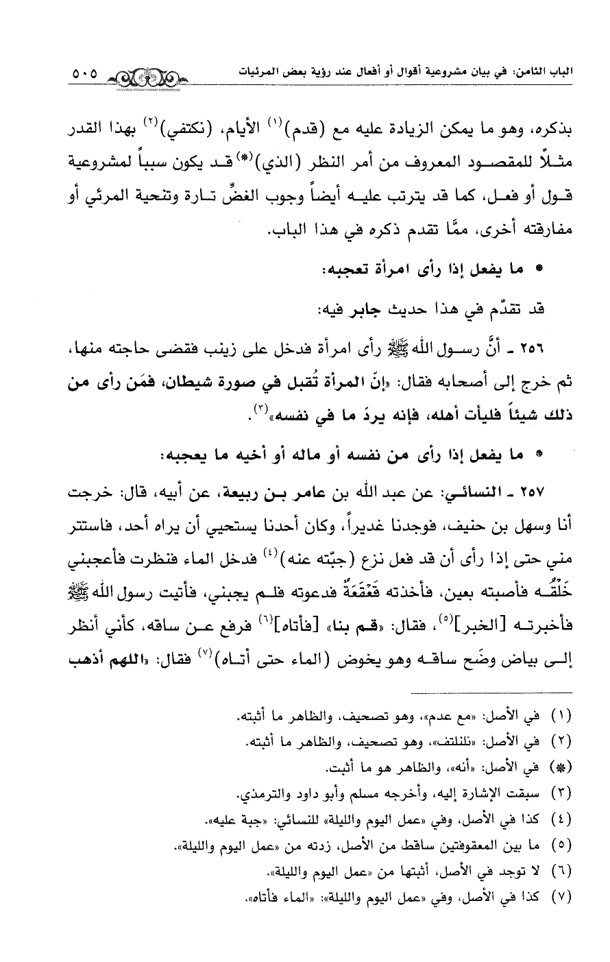 256 - أنَّ رسول الله - صلى الله عليه وسلم - رأى امرأة فدخل على زينب فقضى حاجته منها، ثم خرج إلى أصحابه فقال:"إنّ المرأة تُقبل في سورة شيطان، فمَن رأى من ذلك شيئاً فليأت أهله، فإنه يردّ ما في نفسه" (¬3).
