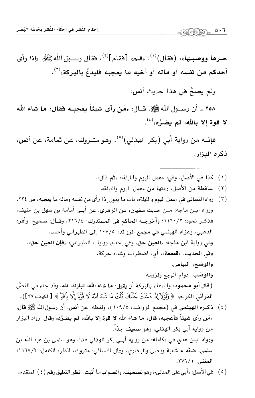 (¬4) ذكره الهيثمي في (مجمع الزوائد: 5/ 109)، ولفظه: عن أنس: أن رسول الله - صلى الله عليه وسلم - قال: "مَن رأى شيئاً فأعجبه، قال: ما شاء الله لا قوة إلا بالله، لم يضرَّه" وقال: رواه البزار من رواية أبي بكر الهذلي، وهو ضعيف جدّاً.