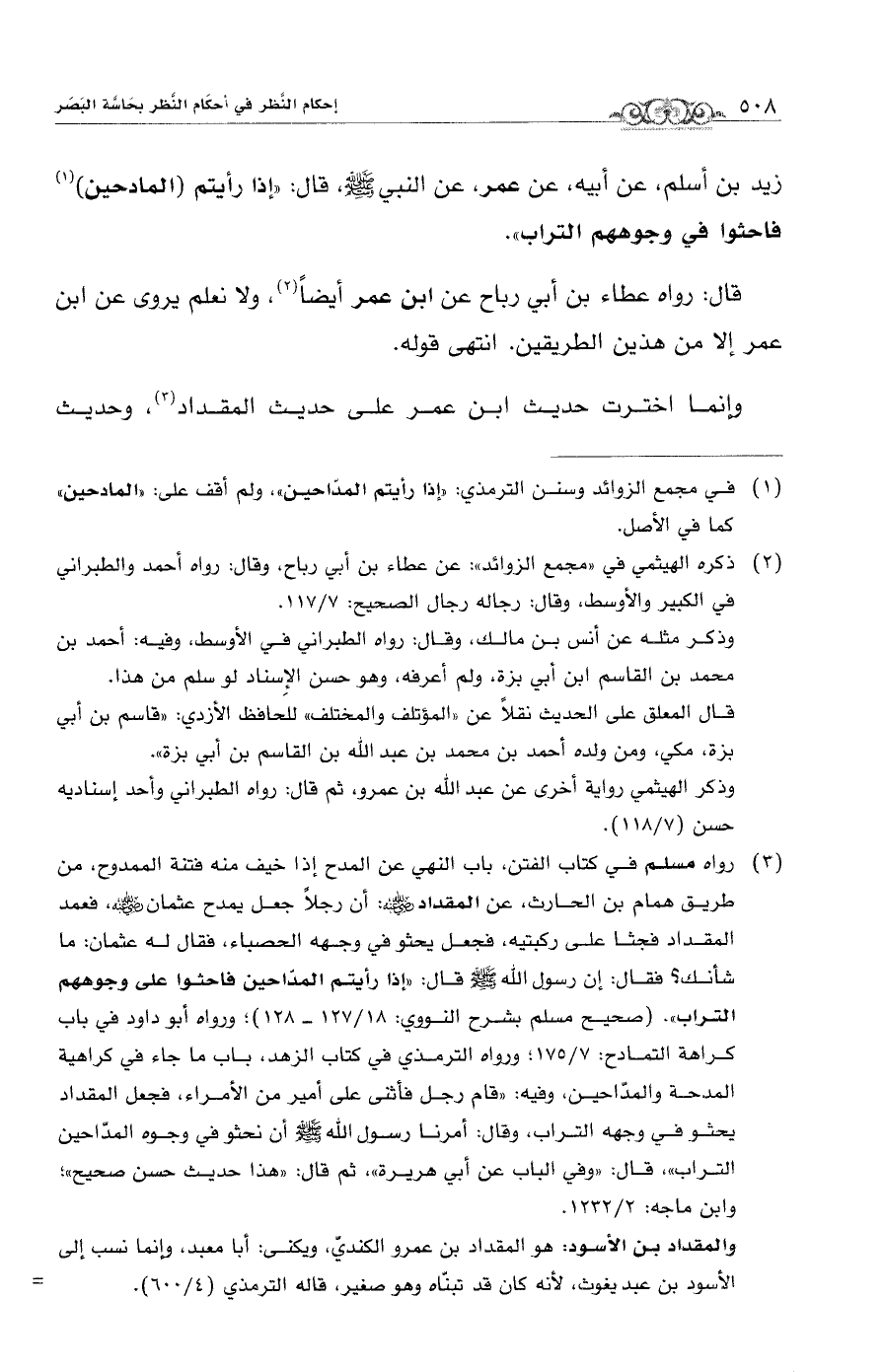 (¬3) رواه مسلم في كتاب الفتن، باب النهي عن المدح إذا خيف منه فتنة الممدوح، من طريق صمام بن الحارث، عن المقداد - رضي الله عنه -: أن رجلاً جعل يمدح عثمان - رضي الله عنه -، فعمد المقداد فجثا على ركبتيه، فجعل يحثو في وجهه الحصباء، فقال له عثمان: ما شأنك؟ فقال: إن رسول الله - صلى الله عليه وسلم - قال: "إذا رأيتم المدّاحين فاحثوا على وجوههم