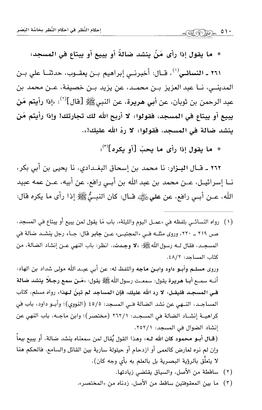 (¬1) رواه النسائي بلفظه في "عمل اليوم والليلة"، باب مَا يقول لمن يبيع أو يبتاع في المسجد، ص: 219 - 220، وروى مثله في "المجتبى" عن جابر قال: جاء رجل ينشد ضالة في المسجد، فقال له رسول الله - صلى الله عليه وسلم -:"لا وجدت". انظر: باب النهي عن إنشاد الضالة، من كتاب المساجد: 2/ 48.