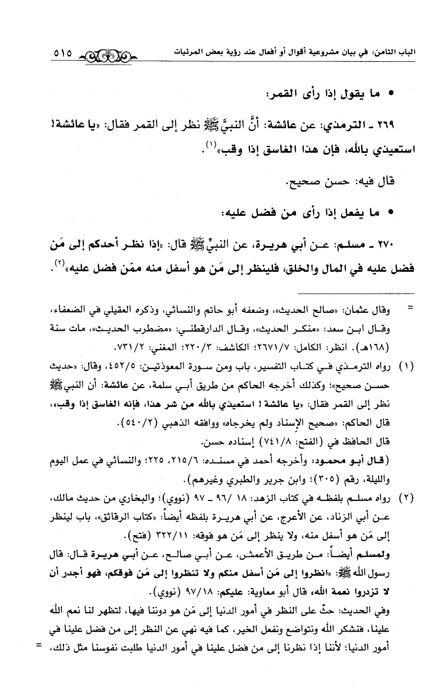 269 - الترمذي: عن عائشة: أنَّ النبيَّ - صلى الله عليه وسلم - نظر إلى القمر فقال: "يا عائشة! استعيذي بالله، فإن هذا الغاسق إذا وقب" (¬1).