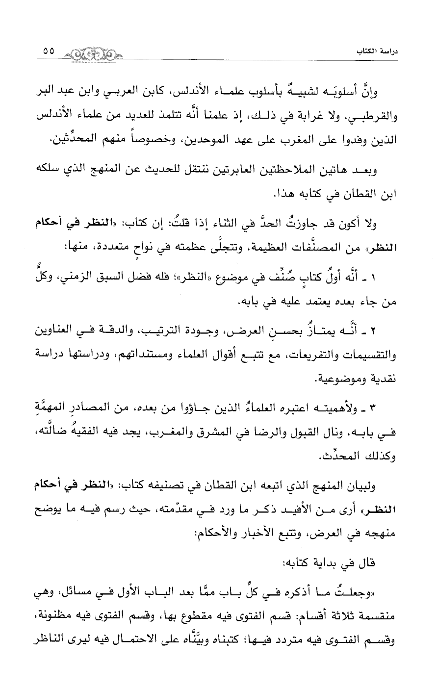 ولبيان المنهج الذي اتبعه ابن القطان في تصنيفه كتاب: "النظر في أحكام النطر" أرى من الأفيد ذكر ما ورد في مقدّمته، حيث رسم فيه ما يوضح منهجه في العرض، وتتبع الأخبار والأحكام: