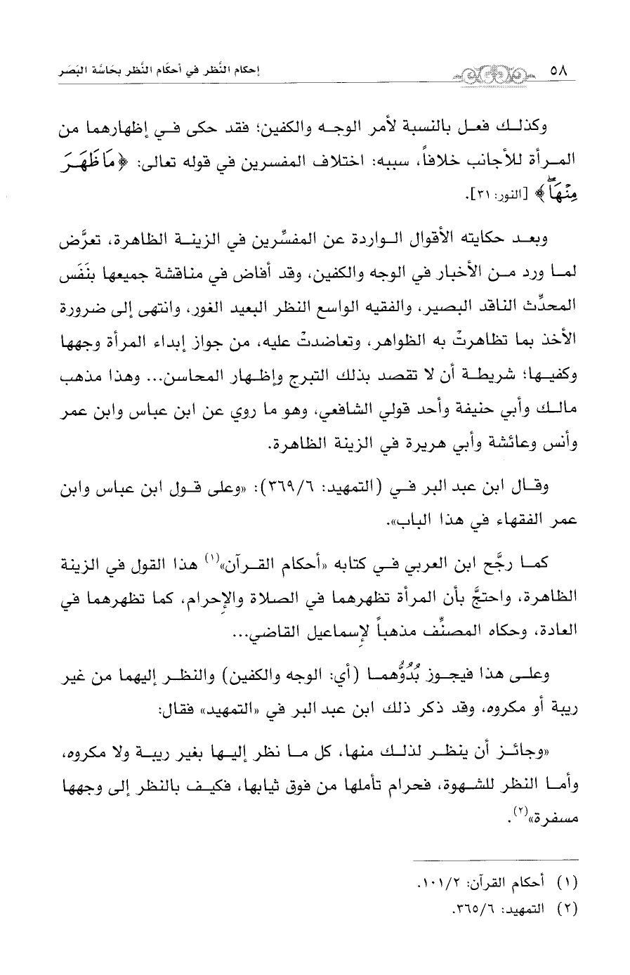وعلى هذا فيجوز بُدُوُّهما (أي: الوجه والكفين) والنظر إليهما من غير ريبة أو مكروه، وقد ذكر ذلك ابن عبد البر في "التمهيد" فقال: