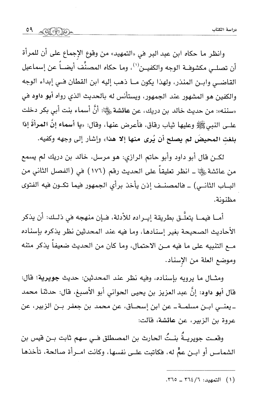 وانظر ما حكاه ابن عبد البر في "التمهيد" من وقوع الإِجماع على أن للمرأة أن تصلي مكشوفة الوجه والكفين (¬1)، وما حكاه المصنِّف أيضًا عن إسماعيل القاضي وابن المنذر، ولهذا يكون ما ذهب إليه ابن القطان في إبداء الوجه والكفين هو المشهور عند الجمهور، ويستأنس له بالحديث الذي رواه أبو داود في "سننه": من حديث خالد بن دريك، عن عائشة - رضي الله عنهما -: أنَّ أسماء بنت أبي بكر دخلت على النبي - صلى الله عليه وسلم - وعليها ثياب رقاق، فأعرض عنها، وقال: "يا أسماء إنَّ المرأةَ إذا بلغتِ المحيضَ لم يصلح أن يُرى منها إلا هذا" وأشار إلى وجهه وكفيه.